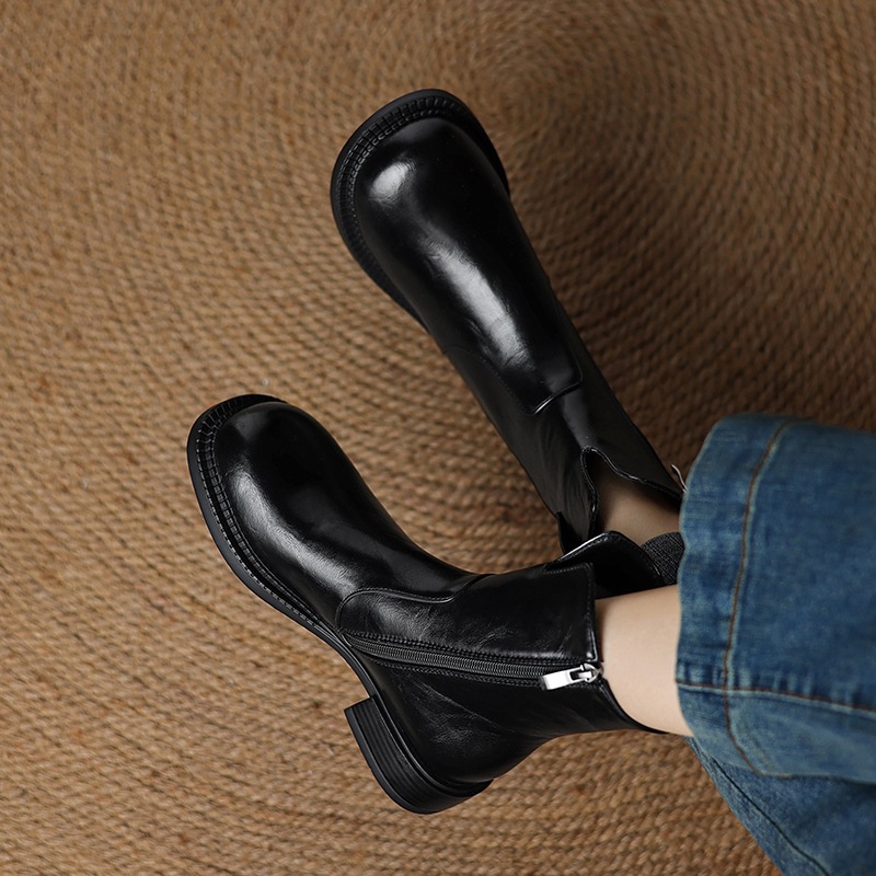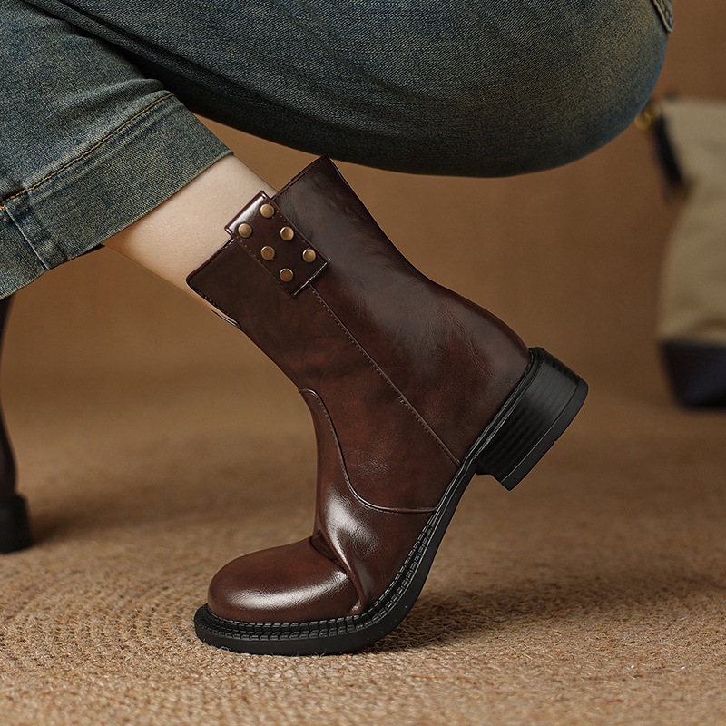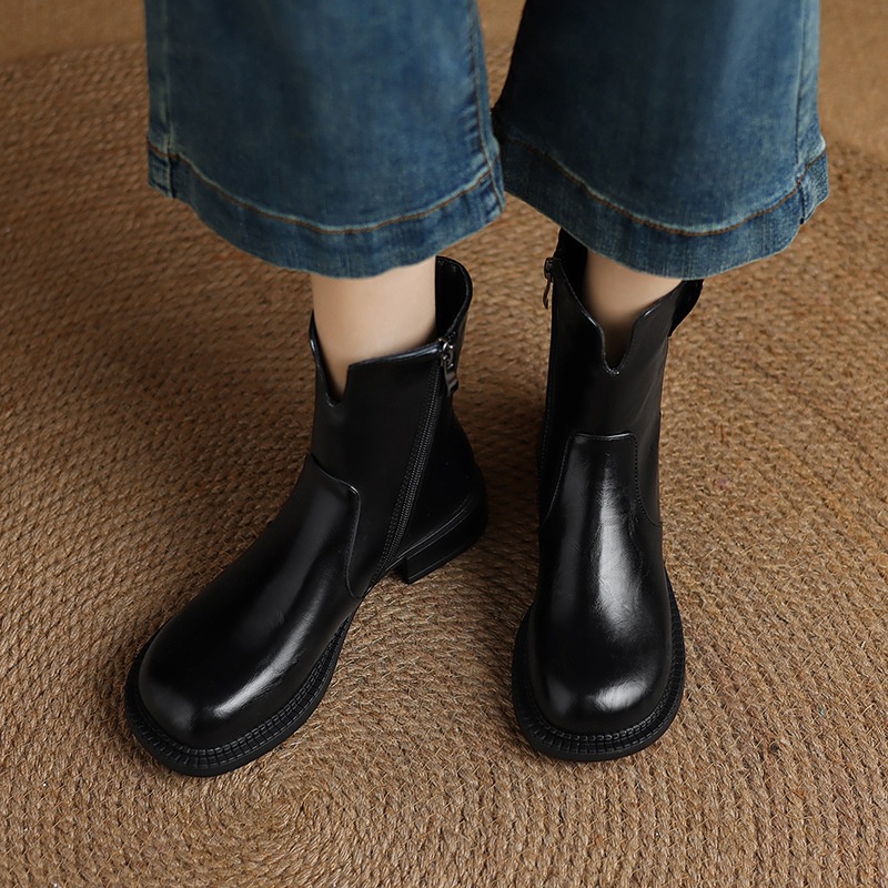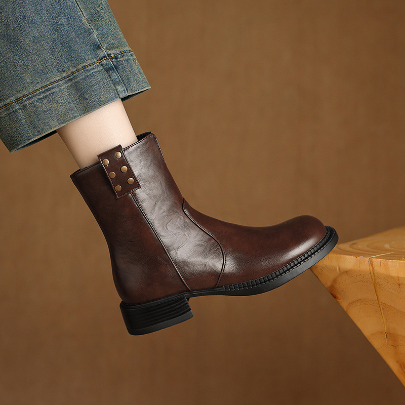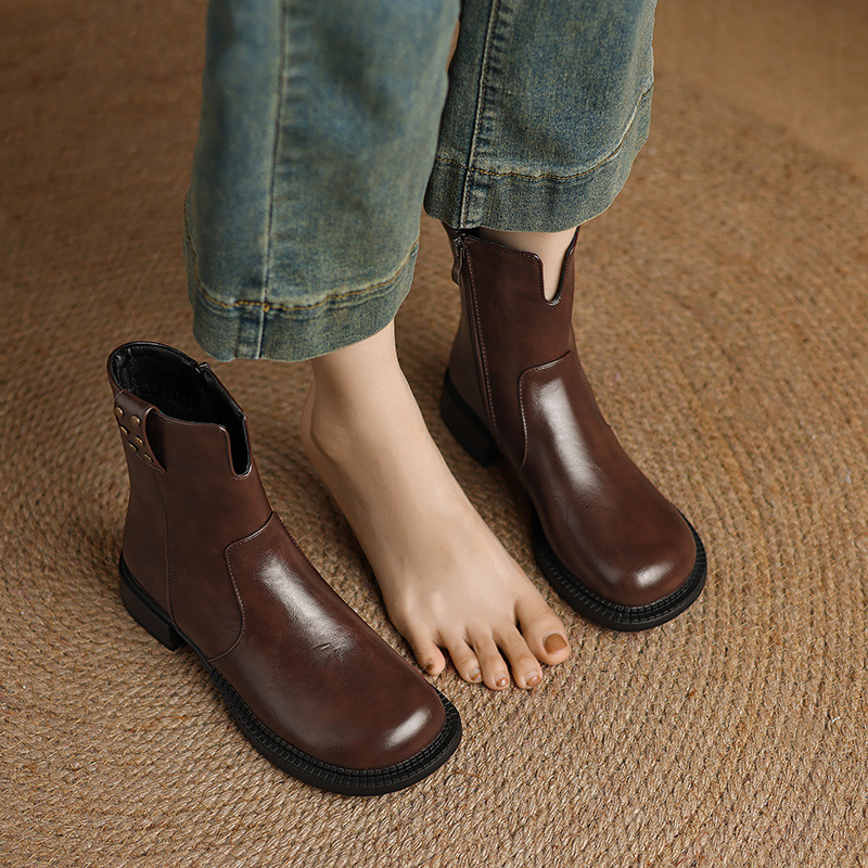 Breakj Breakj Plus Size Boots Vintage Round Head Western Boots Thick Heel Ankle Boots Women's Fall New Style Side Zipper Low Heel Skinny Boots