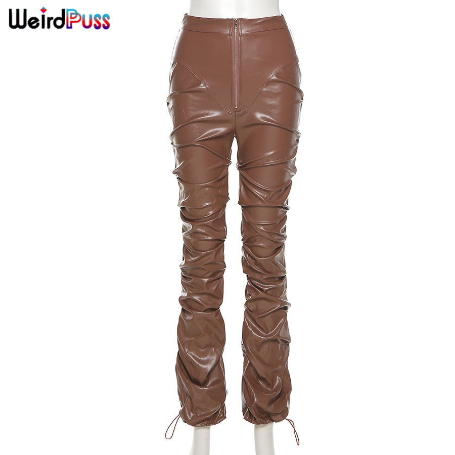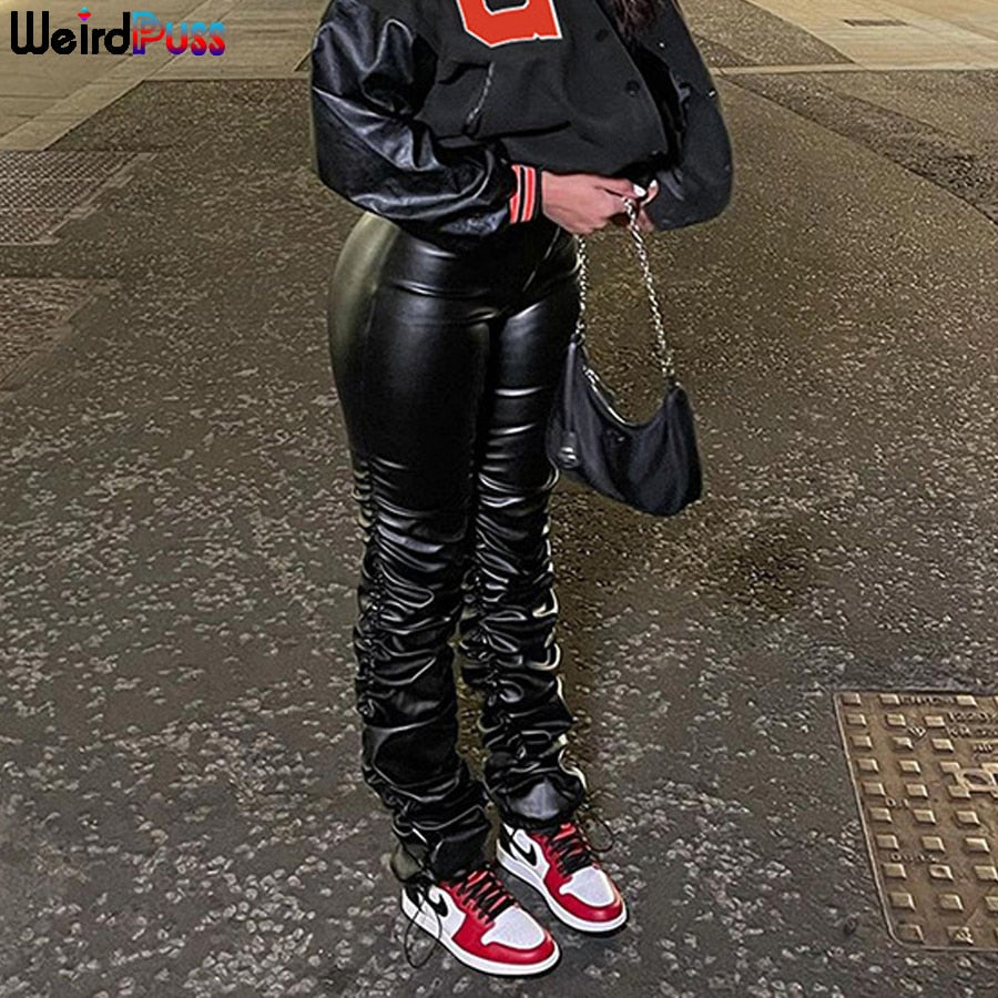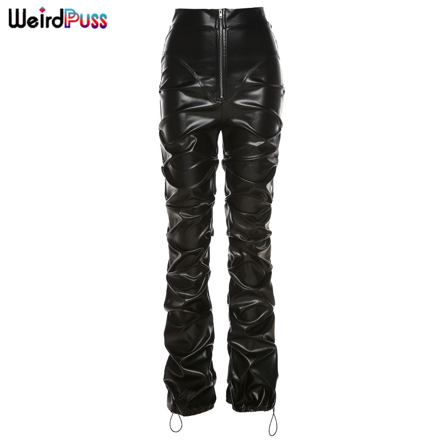 Weird Puss Faux Leather Pants Cyber Y2K Vintage Stacked Zipper Side Slit Drawstring Pencil Pants Trend Streetwear Slim Outfits