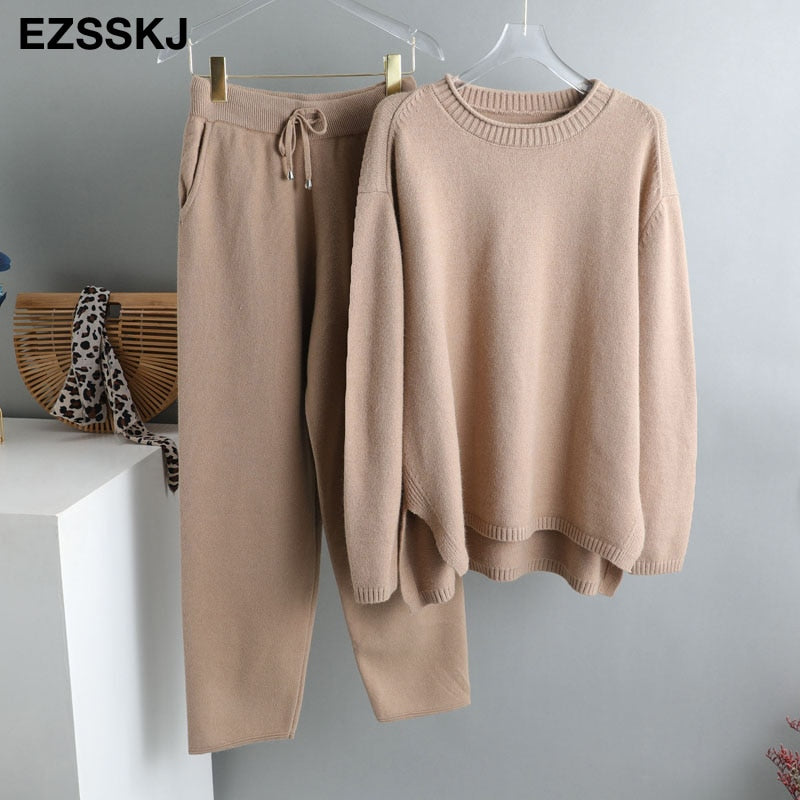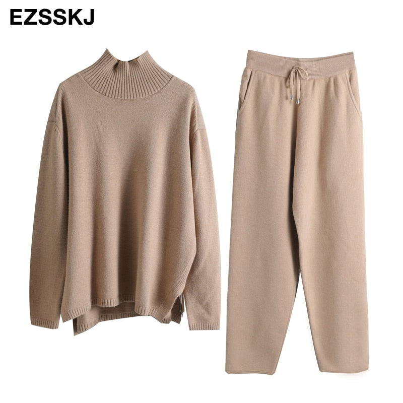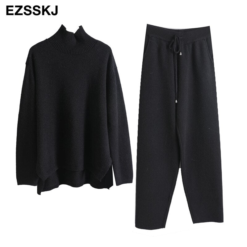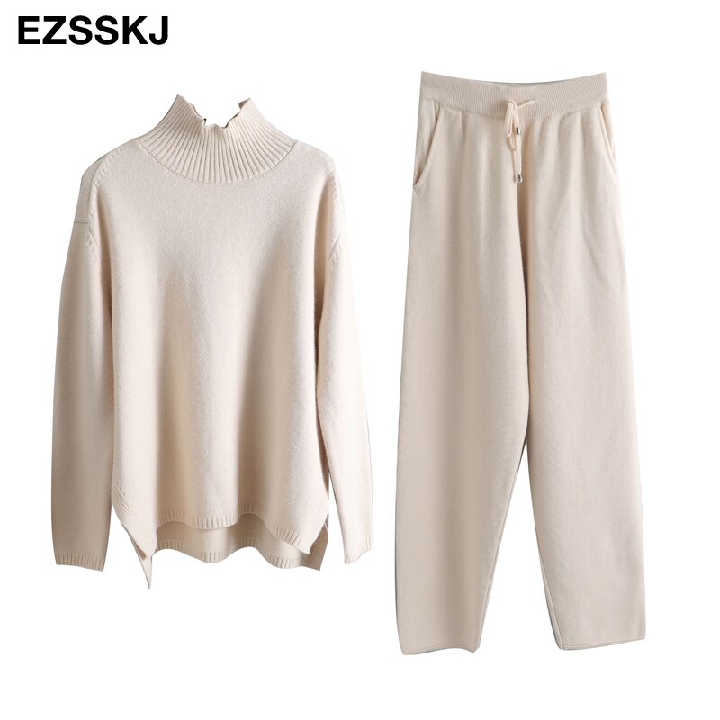 2 Pieces Set Women Knitted Tracksuit Turtleneck Sweater + Carrot Jogging Pants Pullover 2021 Sweater Set CHIC Knitted Outwear
