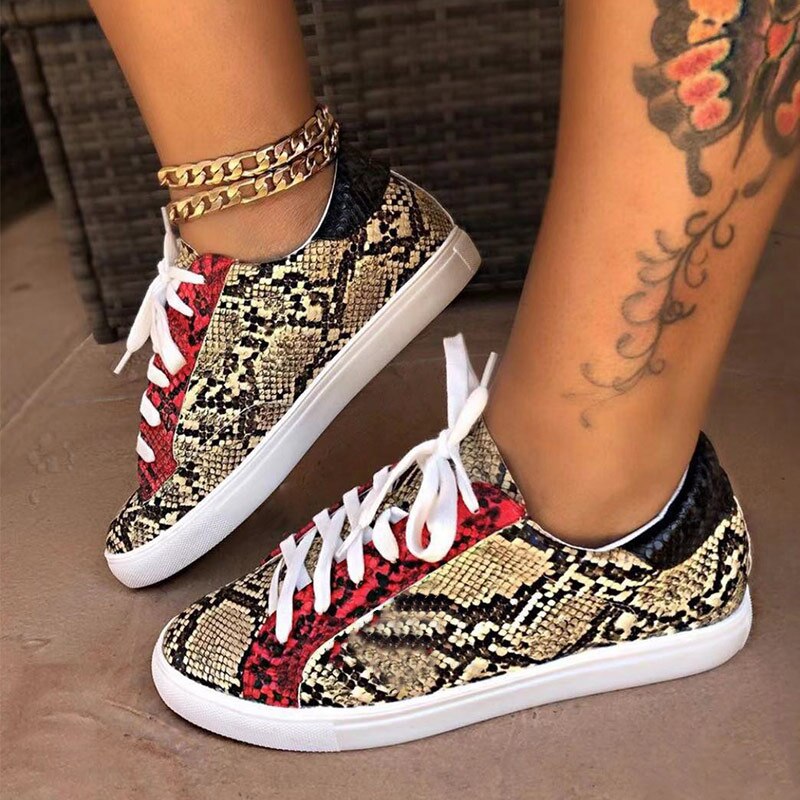 2019 New Women Serpentine Prints Pu Leather Vulcanized Shoes Lace Up Female Sneakers Fashion Casual Platform Woman Flat Shoes