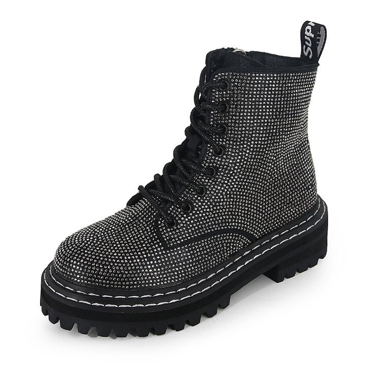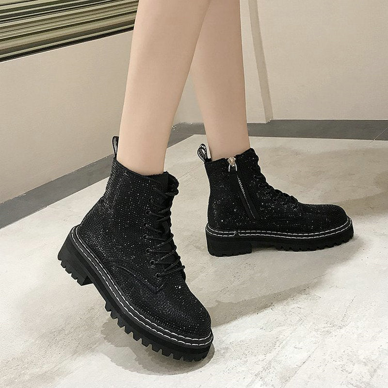 2020 Newest Winter Women Pumps Dress Martin Boots Platform Fashion Rhinestone Lace Up Round Toe Mid Heels Snow Botas Women Shoes