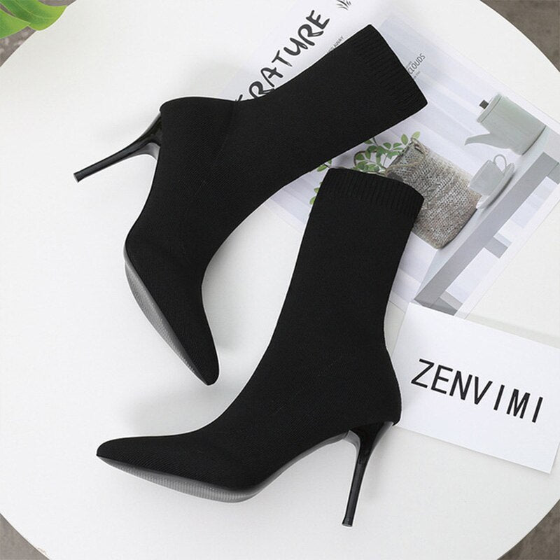 2020 Spring Autumn Sexy Sock Pointed Boots Large Size 42 High Heels for Women Fashion 7cm Glamour Black Ankle Boots Female