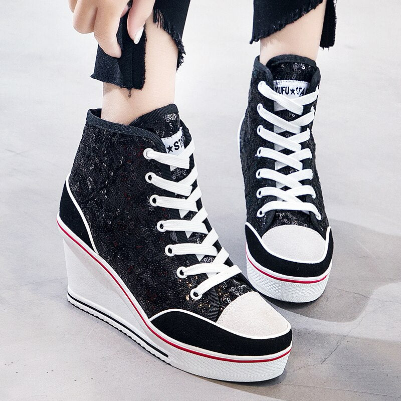 2020 Spring Autumn Women's Shoes Pink Black Silver Glitter Vulcanize Shoes Woman Platform Wedge Sneakers Casual Zapatos De Mujer