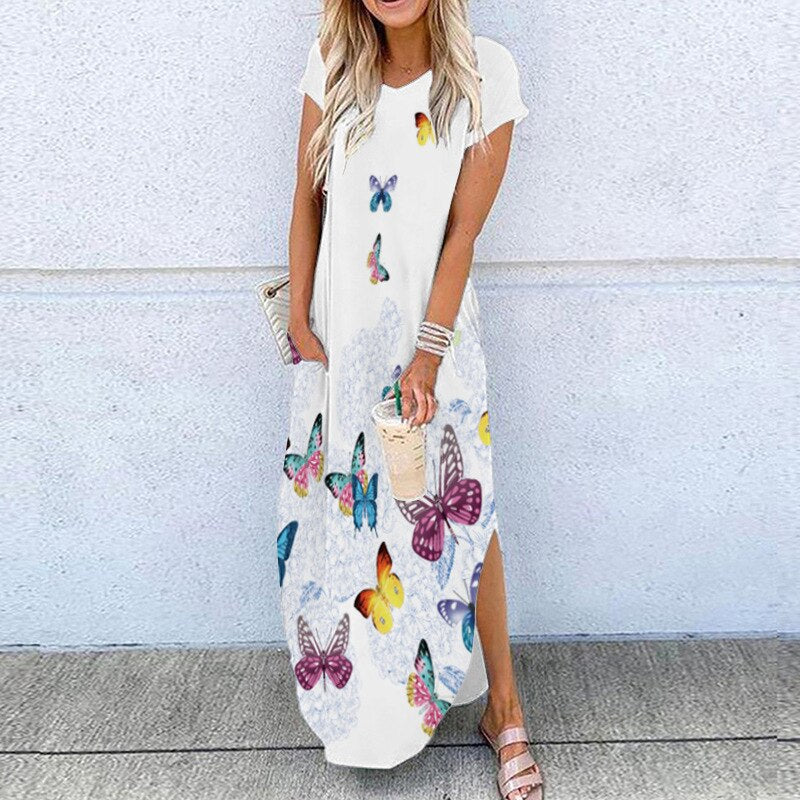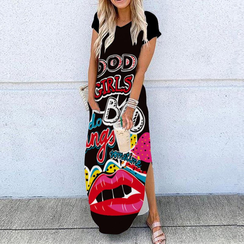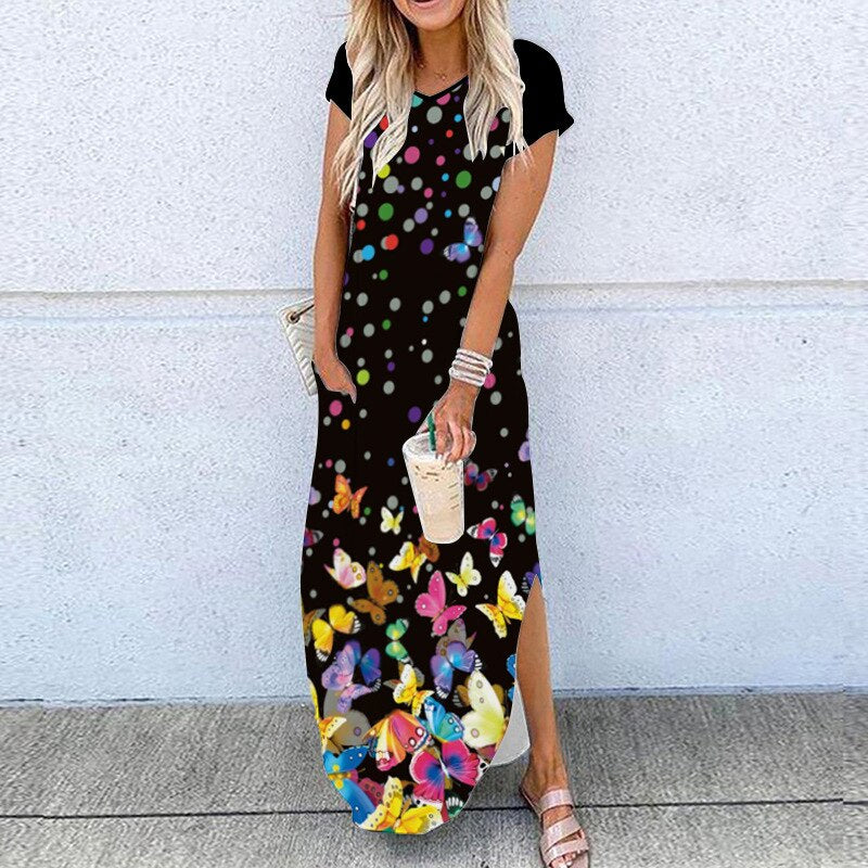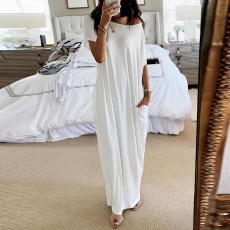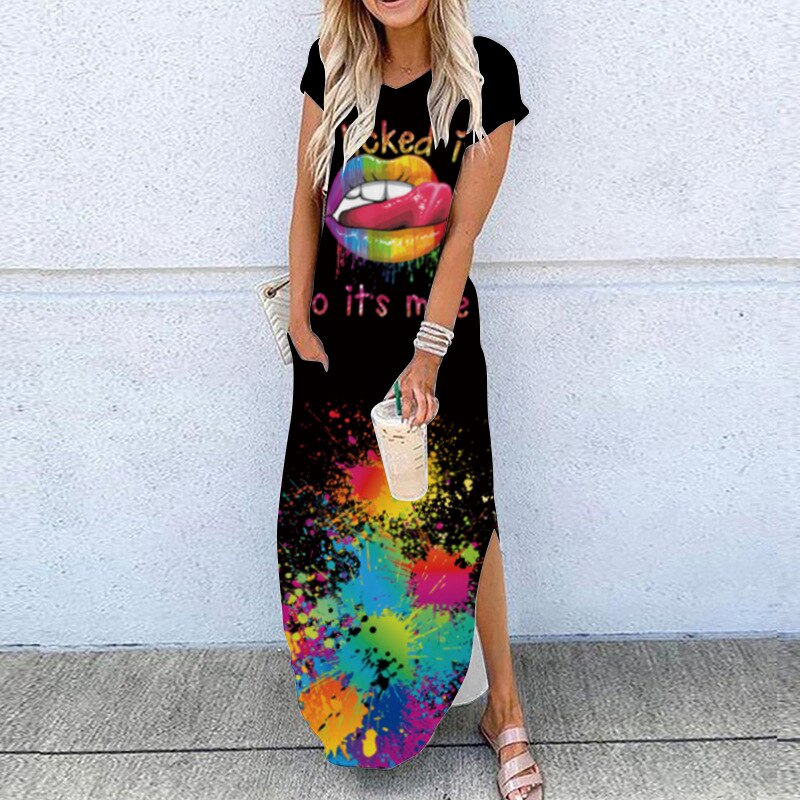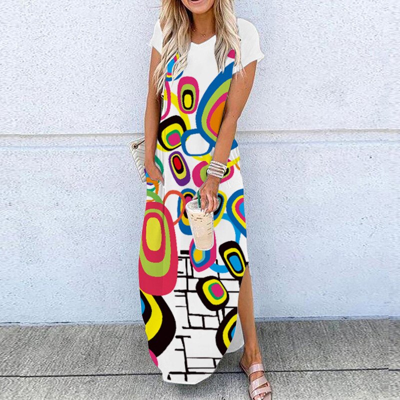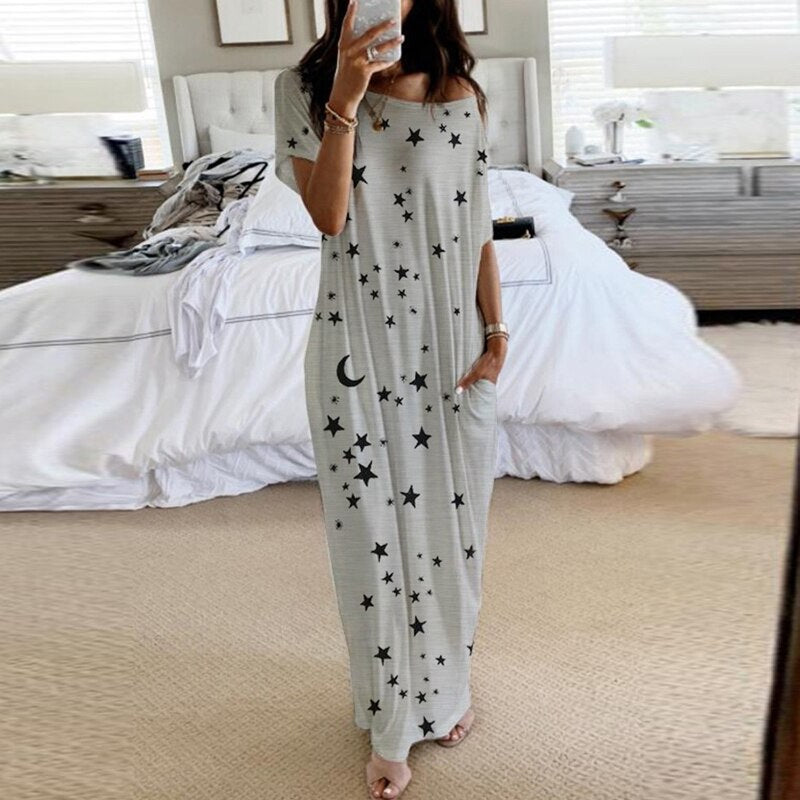 2020 Summer New Fashion Striped Strapless Dress Loose Round Neck Short Sleeve Long Dress Casual Elegant Moon Star Printing Dress