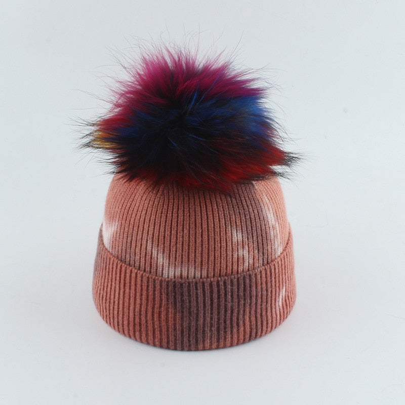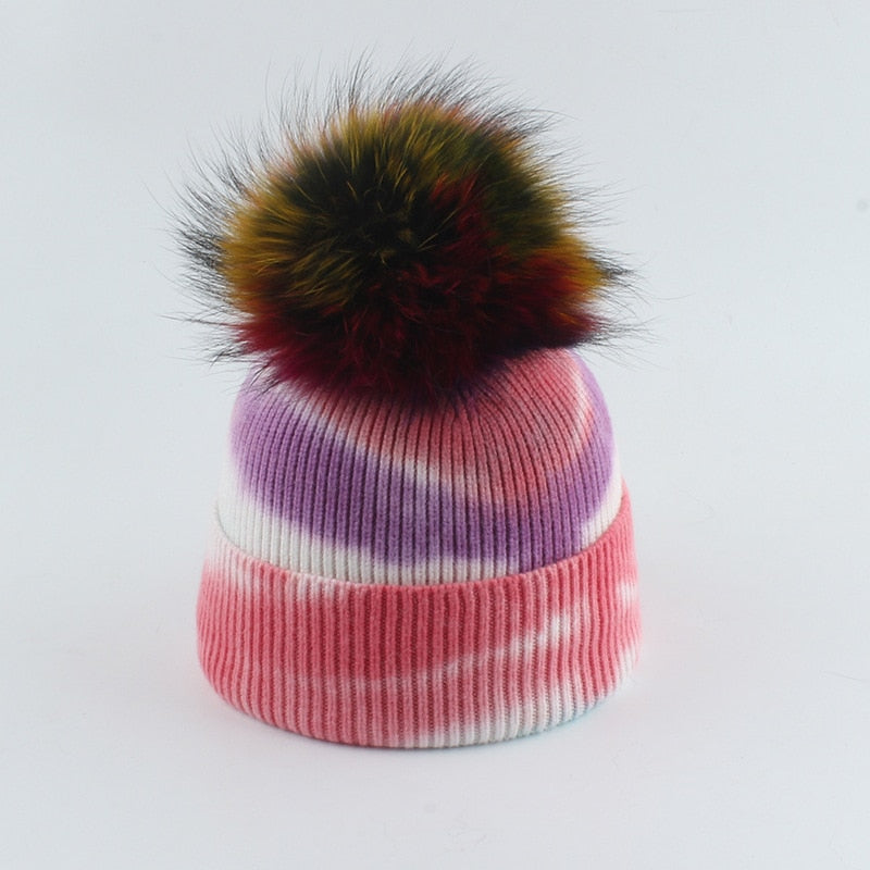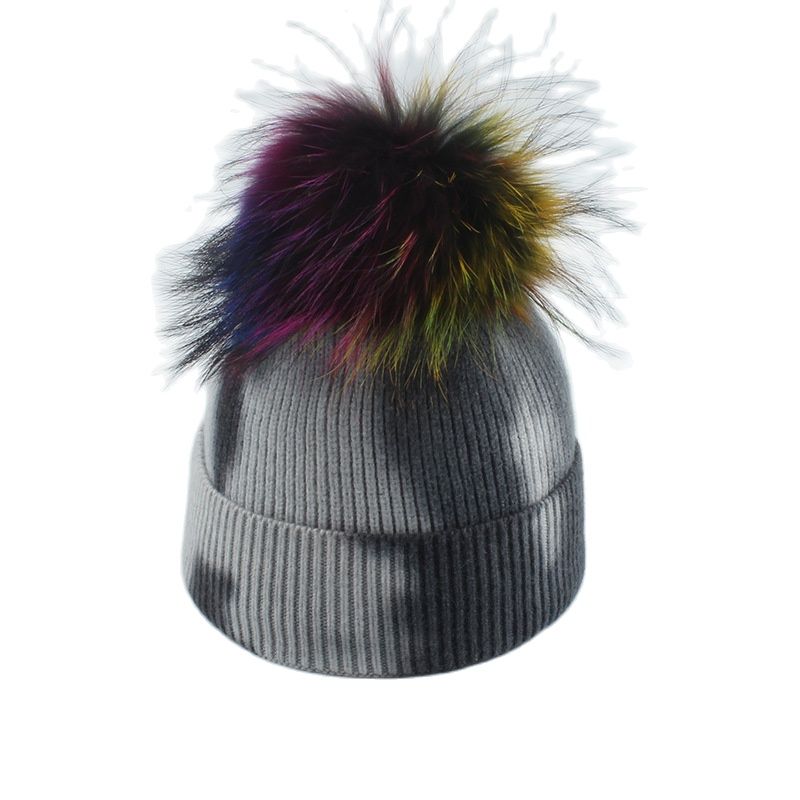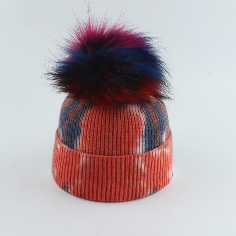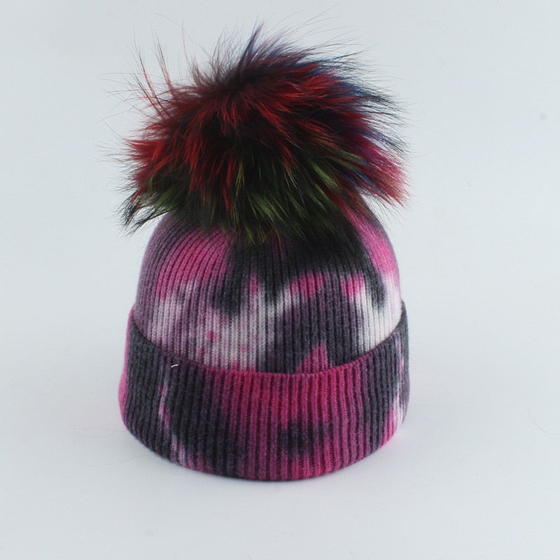 2021 New Fashion Winter Thicken Knitted Hats Warm Real Racoon Fur Pompom Unisex Beanie Tie-dyed Cap Adults Head Cover