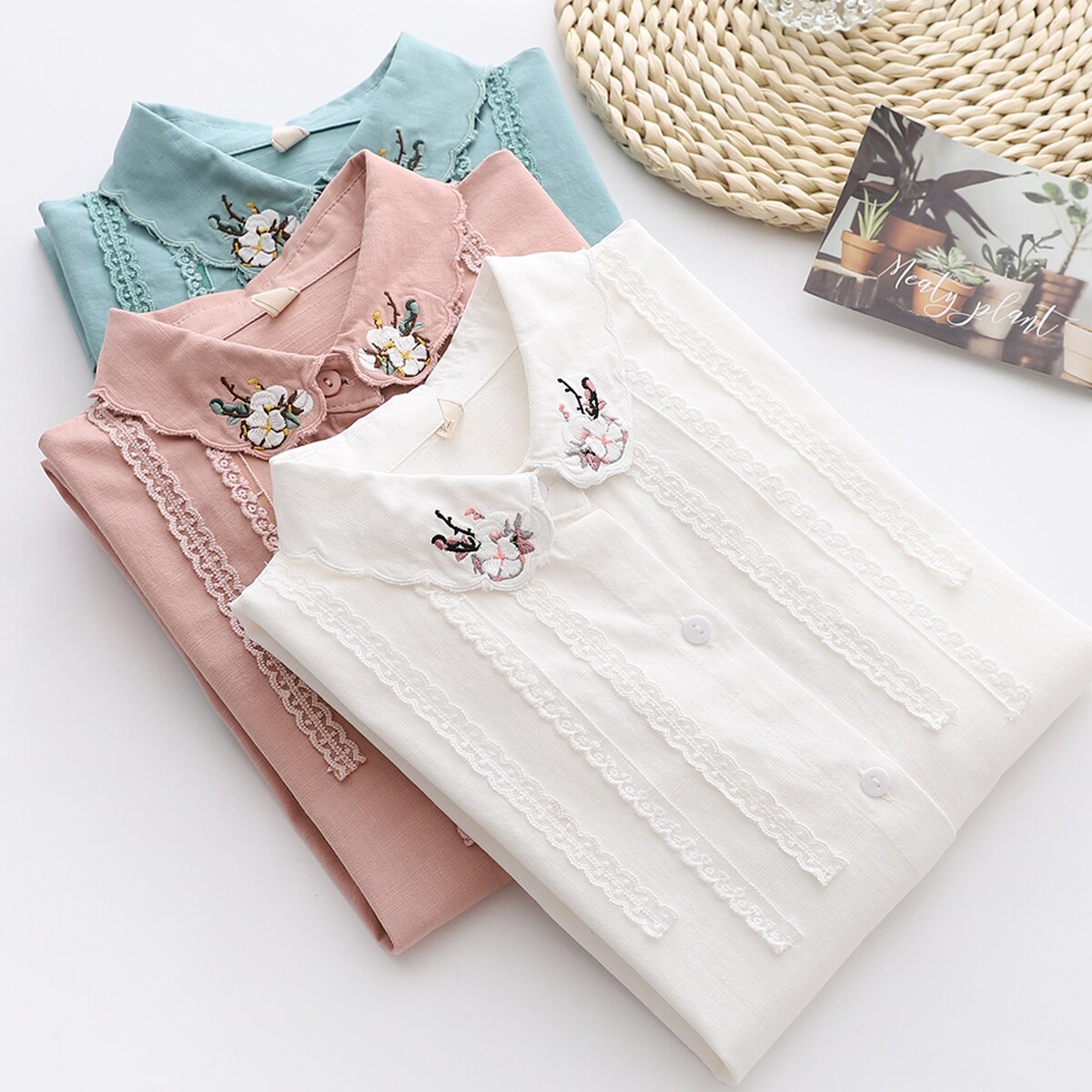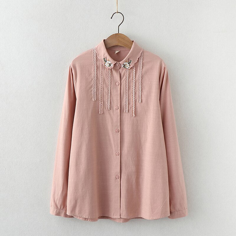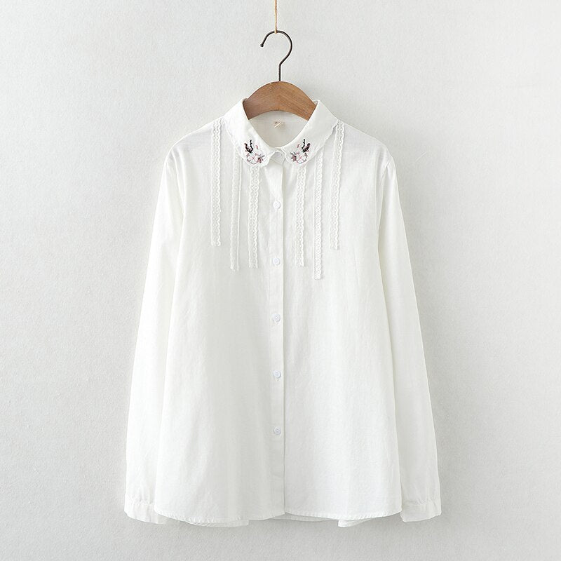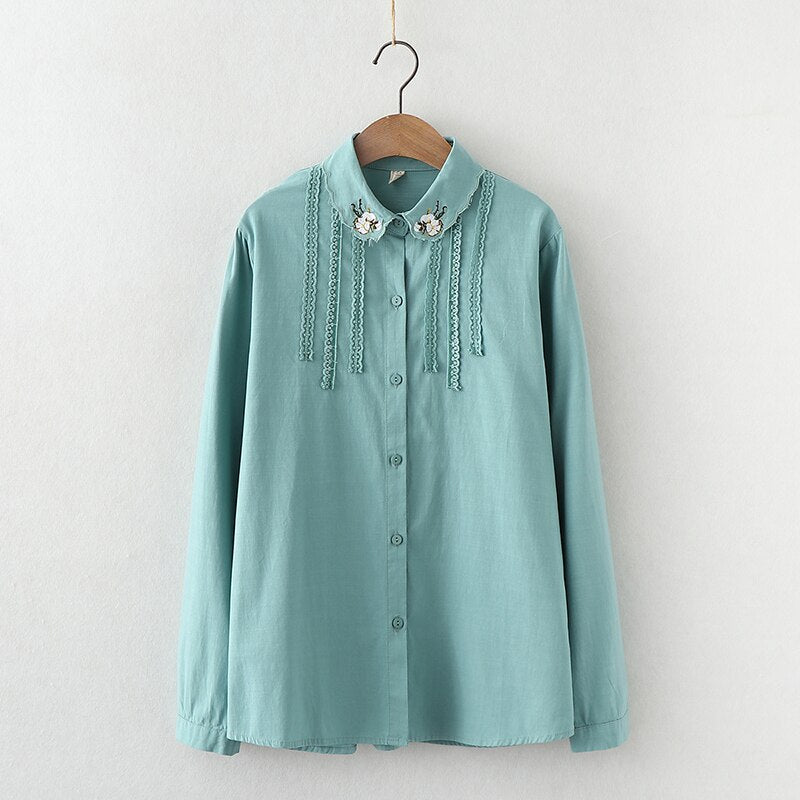 2021 New Fine Women's Tops Flowers Embroidery Shirts Woman Long Sleeve Blouse White Green Lady Loose Cotton Shirts Clothes