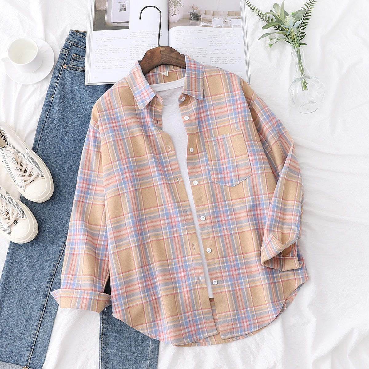 2021 New Long Sleeve Loose Casual Womens Plaid Shirt Fine Fresh College Style Design Blouses And Tops Female Checked Clothes