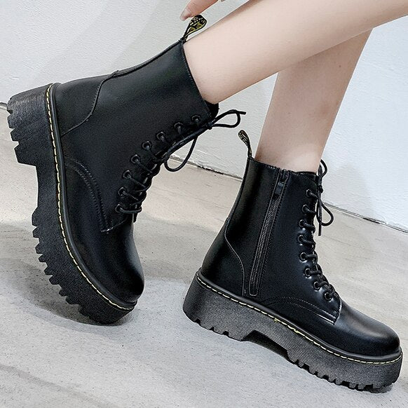 2021 Winter Fashion Women's Boots Lace Up Round Head Women Martin Boots Black Mid Heel Square Heel PU Leather Boots Women