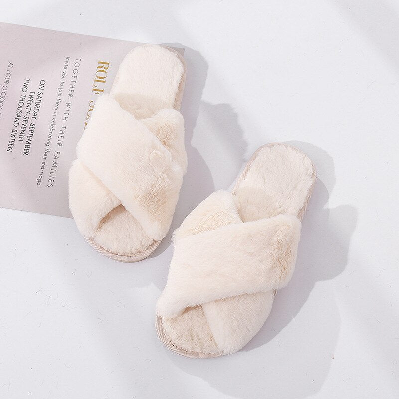 2021 Winter Women House Slippers Faux Fur Fashion Cross Warm Shoes Woman Flats Female Open Toes Slides Pink Cozy  Furry Slippers