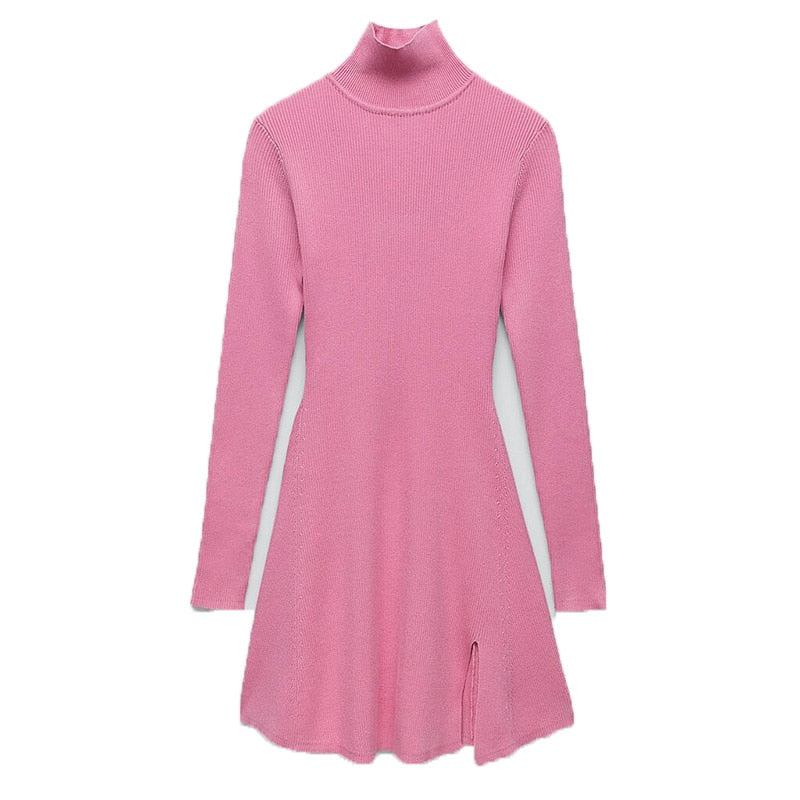 2021 Women Fashion Chic Pink Side Split Slim Knitted Mini Dress Female Elegant Turtleneck Long Sleeve Dresses Vestidos