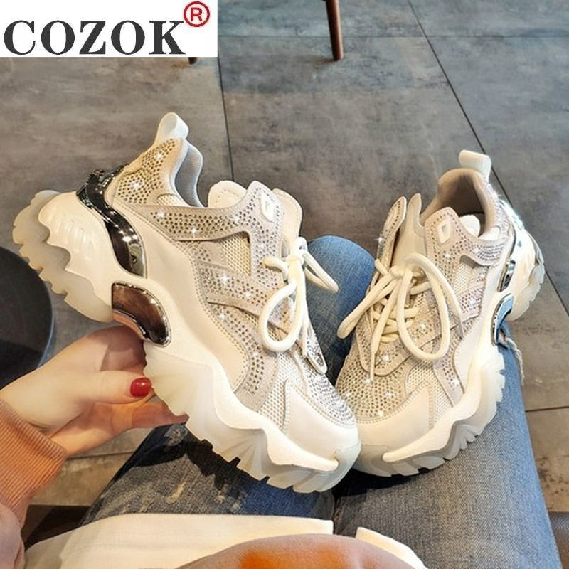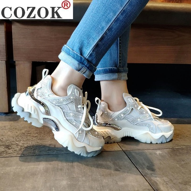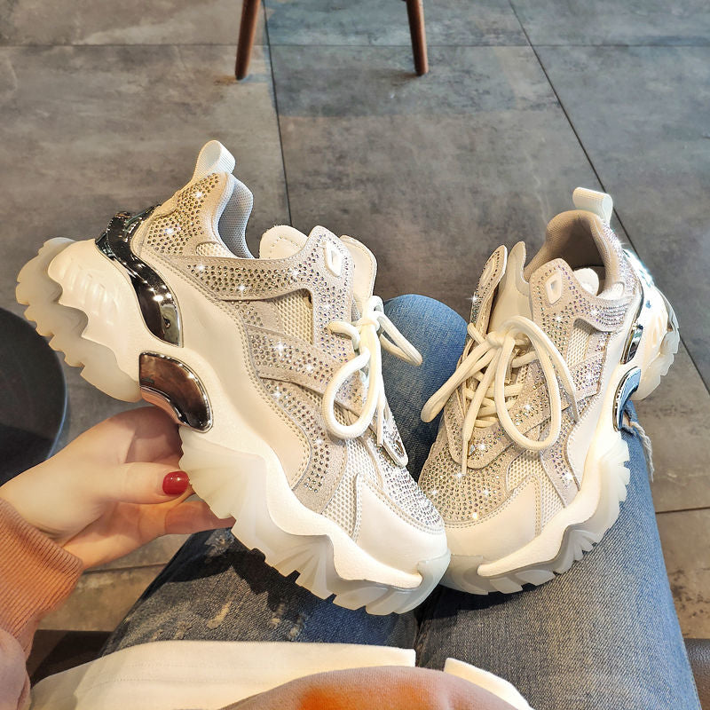 2021 Women's Shoes Comfortable Breathable Mesh Rhinestone Casual Shoes Spring Women's Lace-up Non-slip Wear-resistant Sneakers