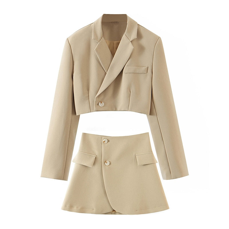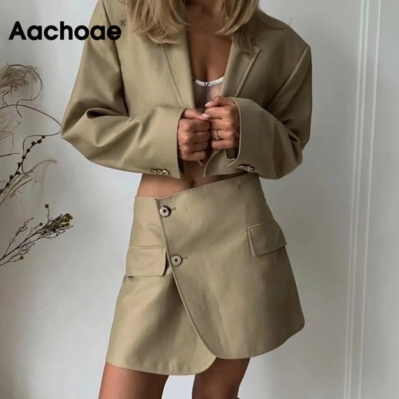 Aachoae Fashion 2 Piece Set Women Blazer Skirt Suit 2021 Solid Color Cropped Blazer Sets Ladies Side Split Mini Skirts Outfits