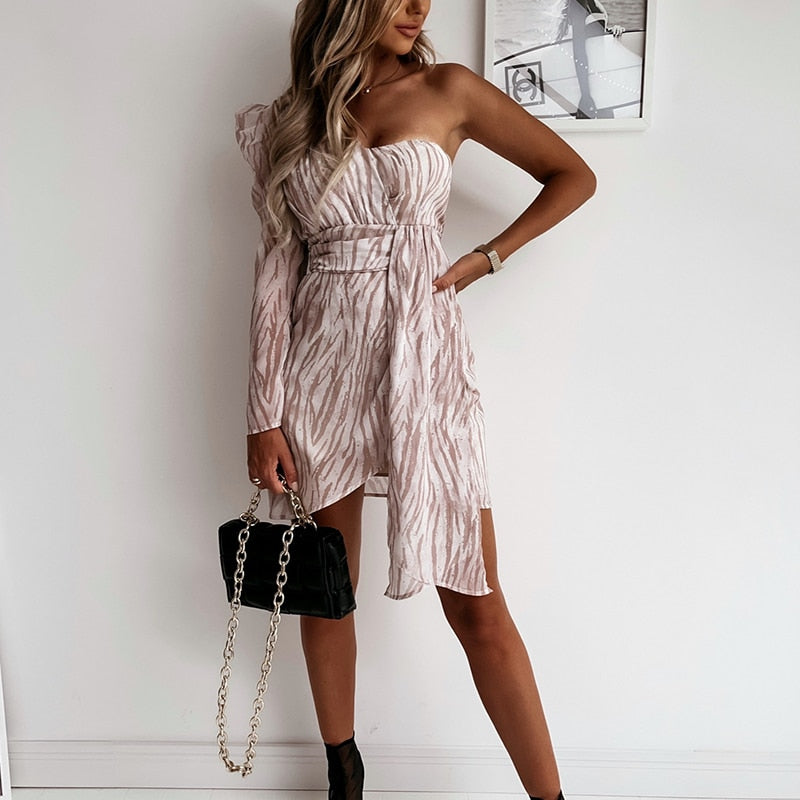 Autumn Women Sexy One-shoulder Long Sleeves Mini Bodycon Dress Bandage Printed Casual Streetwear Party Dresses Elegant Vestidos