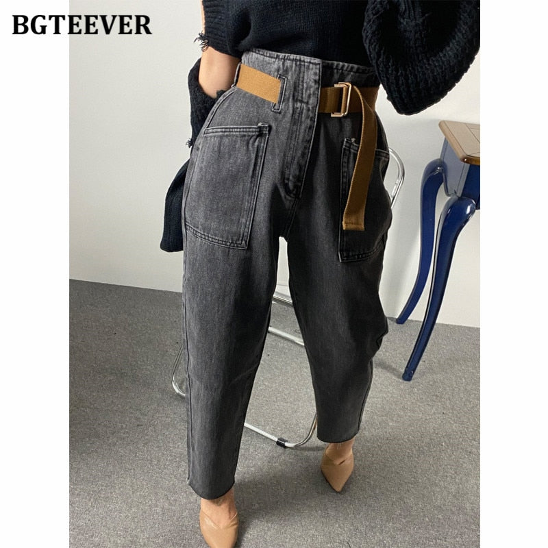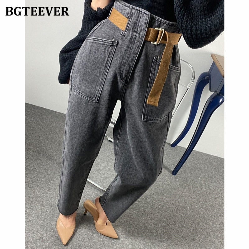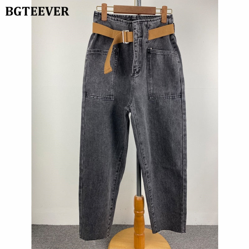 BGTEEVER 2021 Fashion Belted Harem Jeans Pants Women Vintage Ankle Length Denim Baggy Mom Jean Loose Washed Trousers Mujer