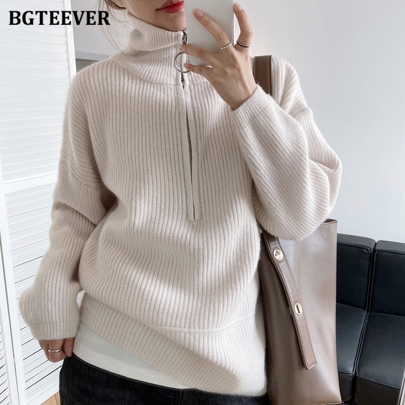 BGTEEVER Autumn Winter Zipper Turtleneck Sweaters Women Casual Thick Long Pullover Jumpers Female Loose Knitting Tops 2021