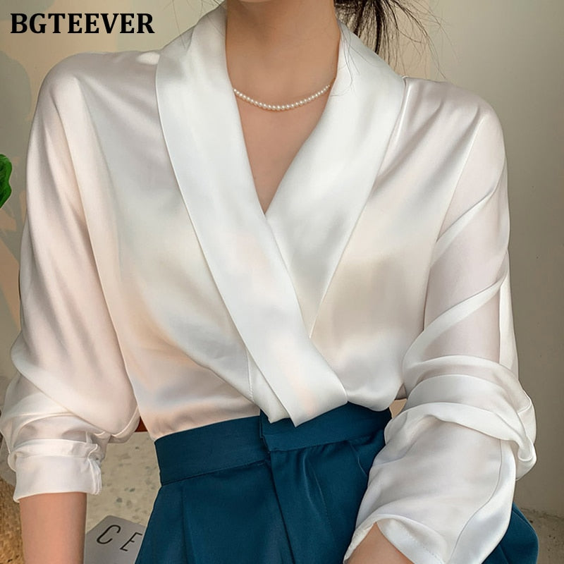 BGTEEVER Elegant V-neck Satin Women Blouses 2021 Autumn Ladies Blusas Full Sleeve Loose Office Wear Female Shirts Tops