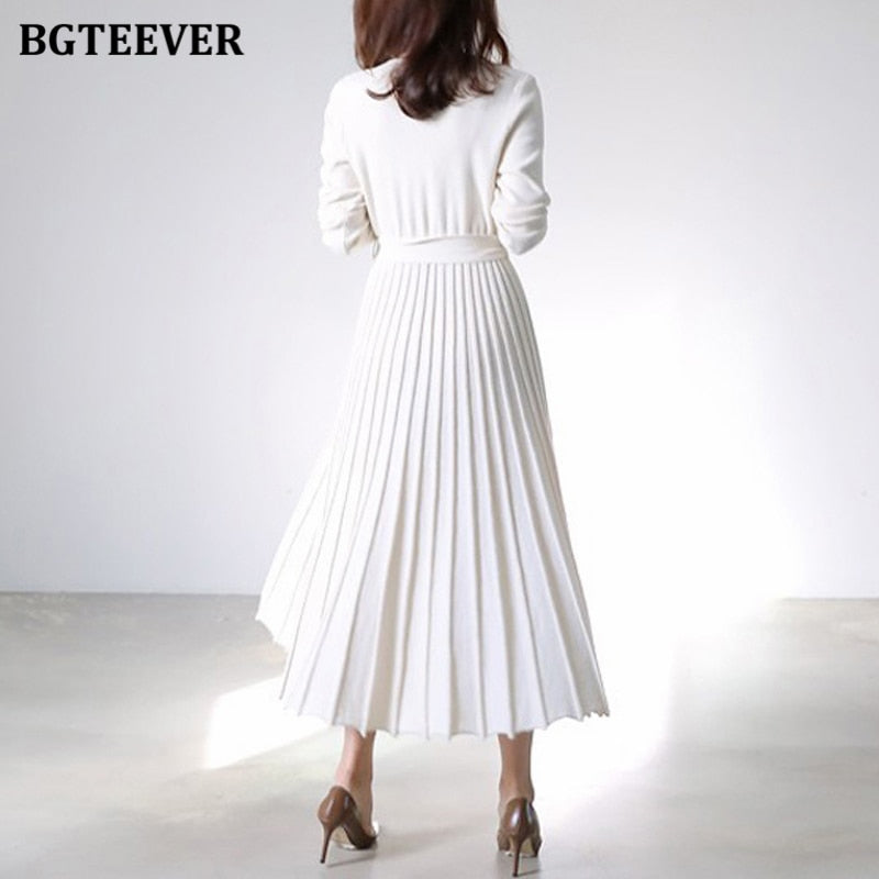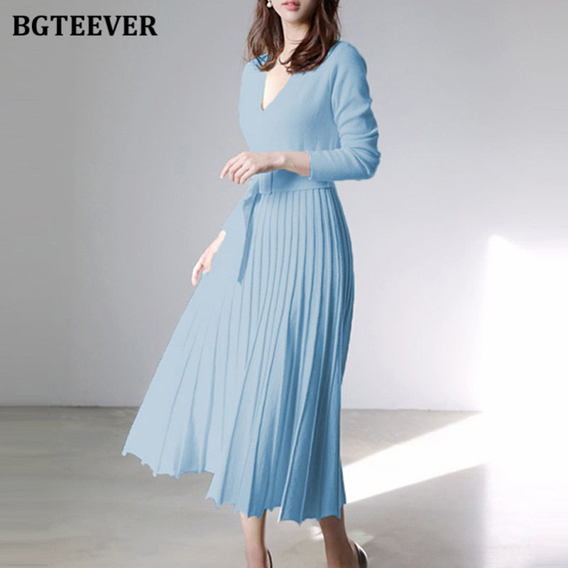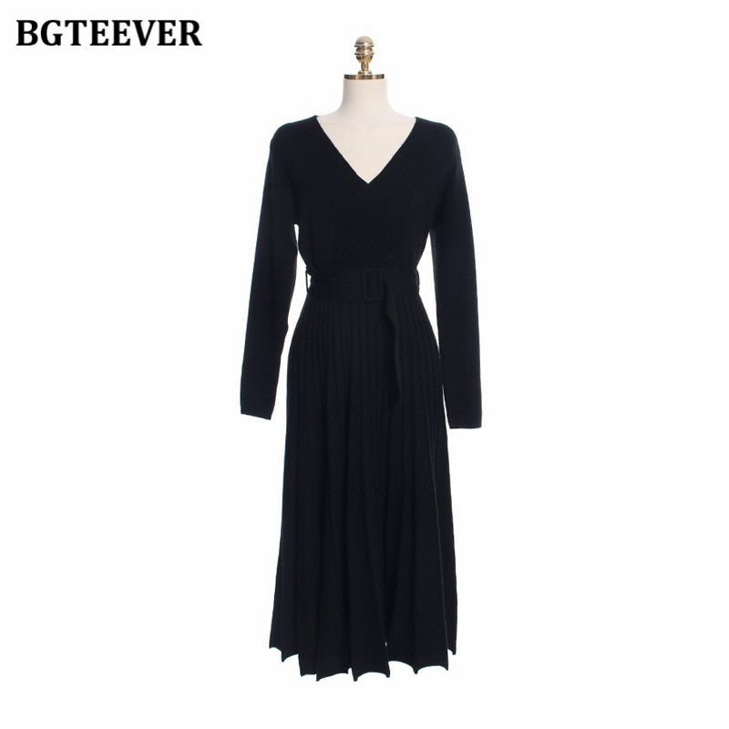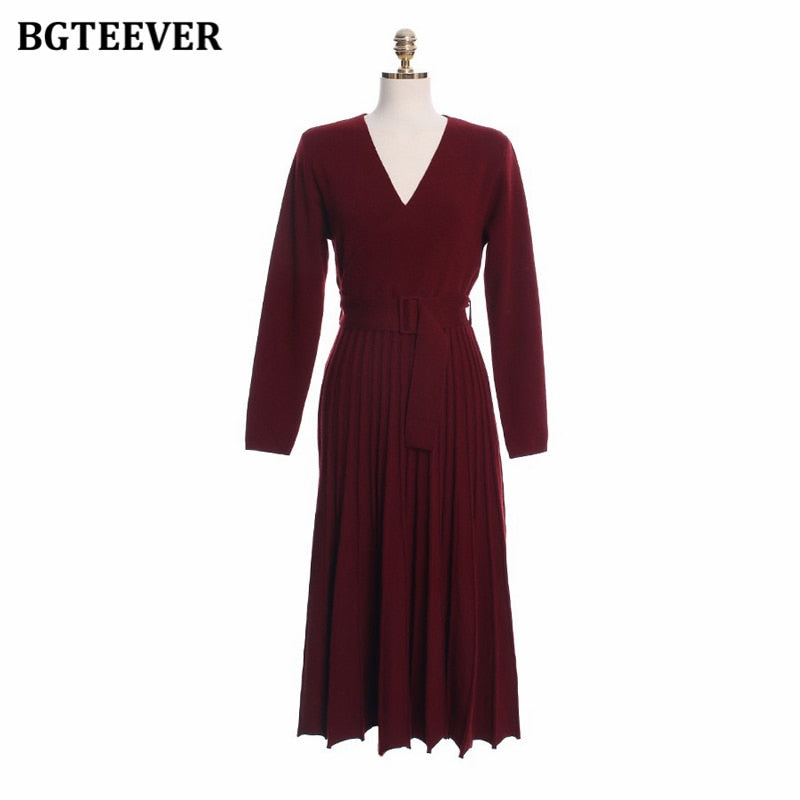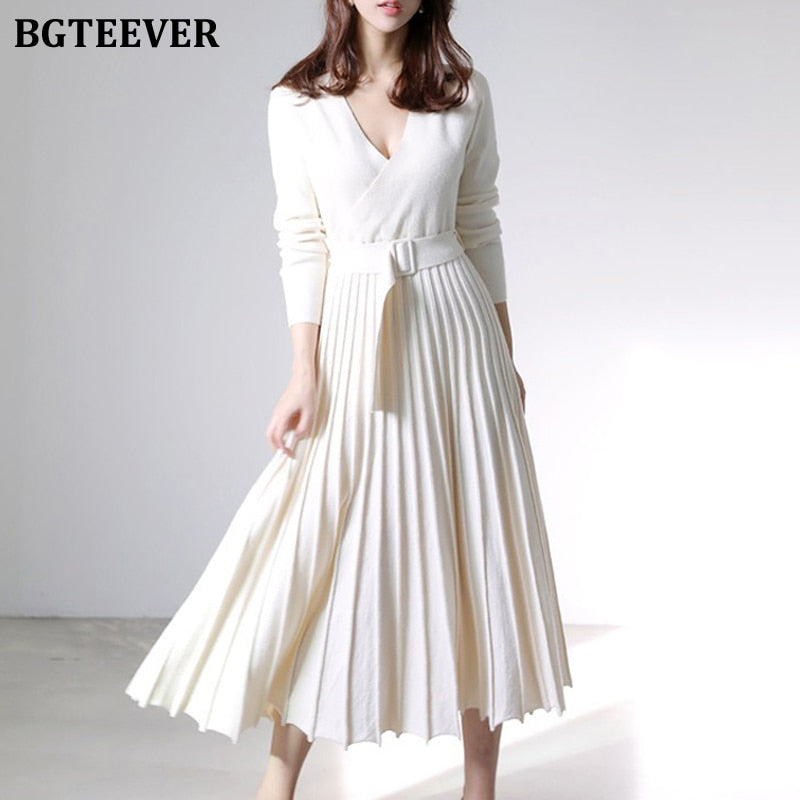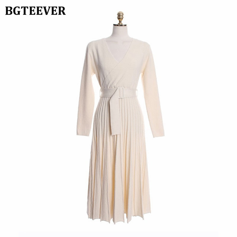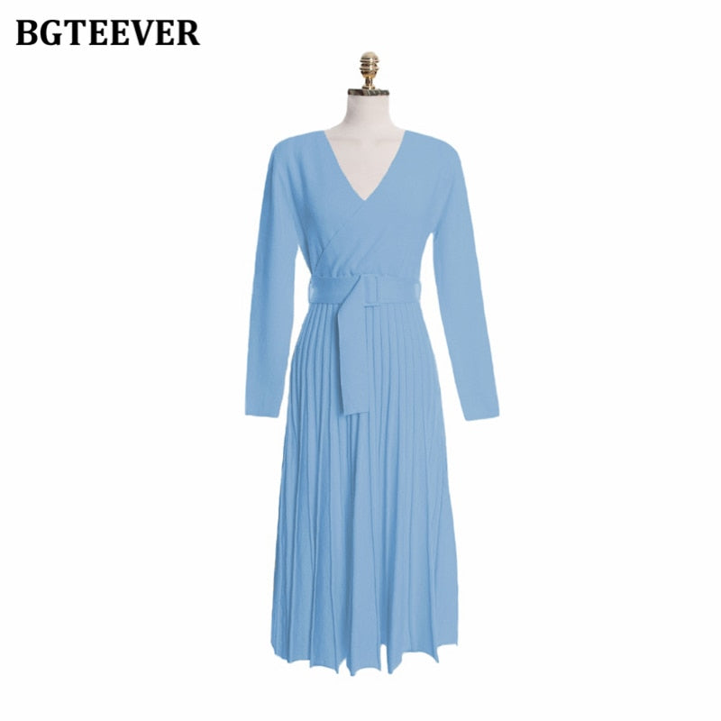 BGTEEVER Elegant V-neck Thick Warm Women Knitted Pleated Dress Long Sleeve Belted Sashes Ladies Sweater Dress 2020 Autumn Winter
