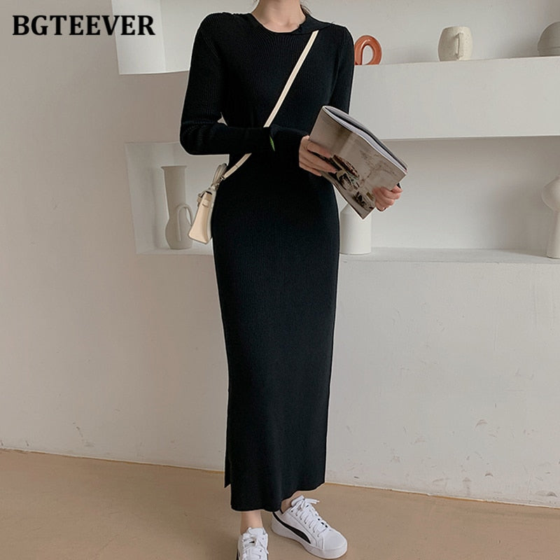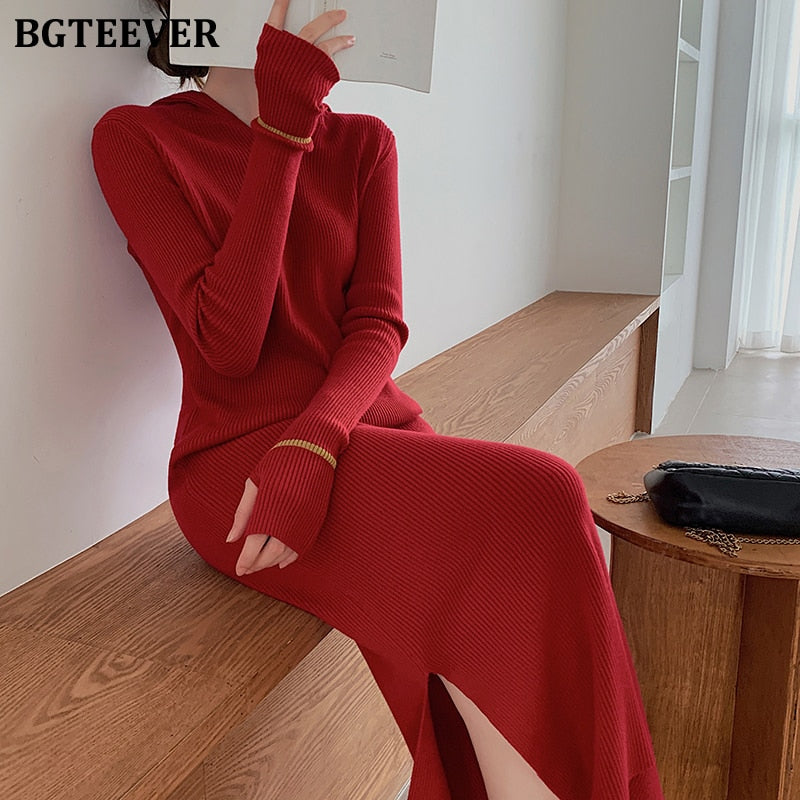 BGTEEVER New Autumn Hooded Side Split Female Knitted Dress Stretched Sweater Women Dress Casual Ladies Pullovers Vestidos 2021
