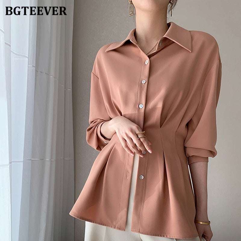 BGTEEVER Stylish Chic Turn-down Collar Women Chiffon Shirts Elegant Single-breasted Slim Waist Female Solid Blouses Tops 2021