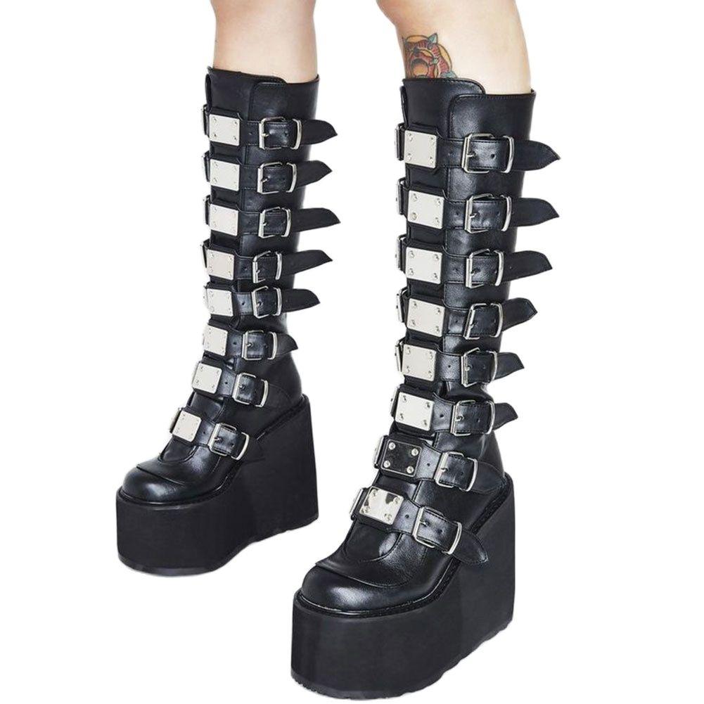 Brand Design Big Size 43 Black Gothic Style Cool Punk Motorcycles Boots Female Platform Wedges High Heels Calf Boots Women Shoes 1118