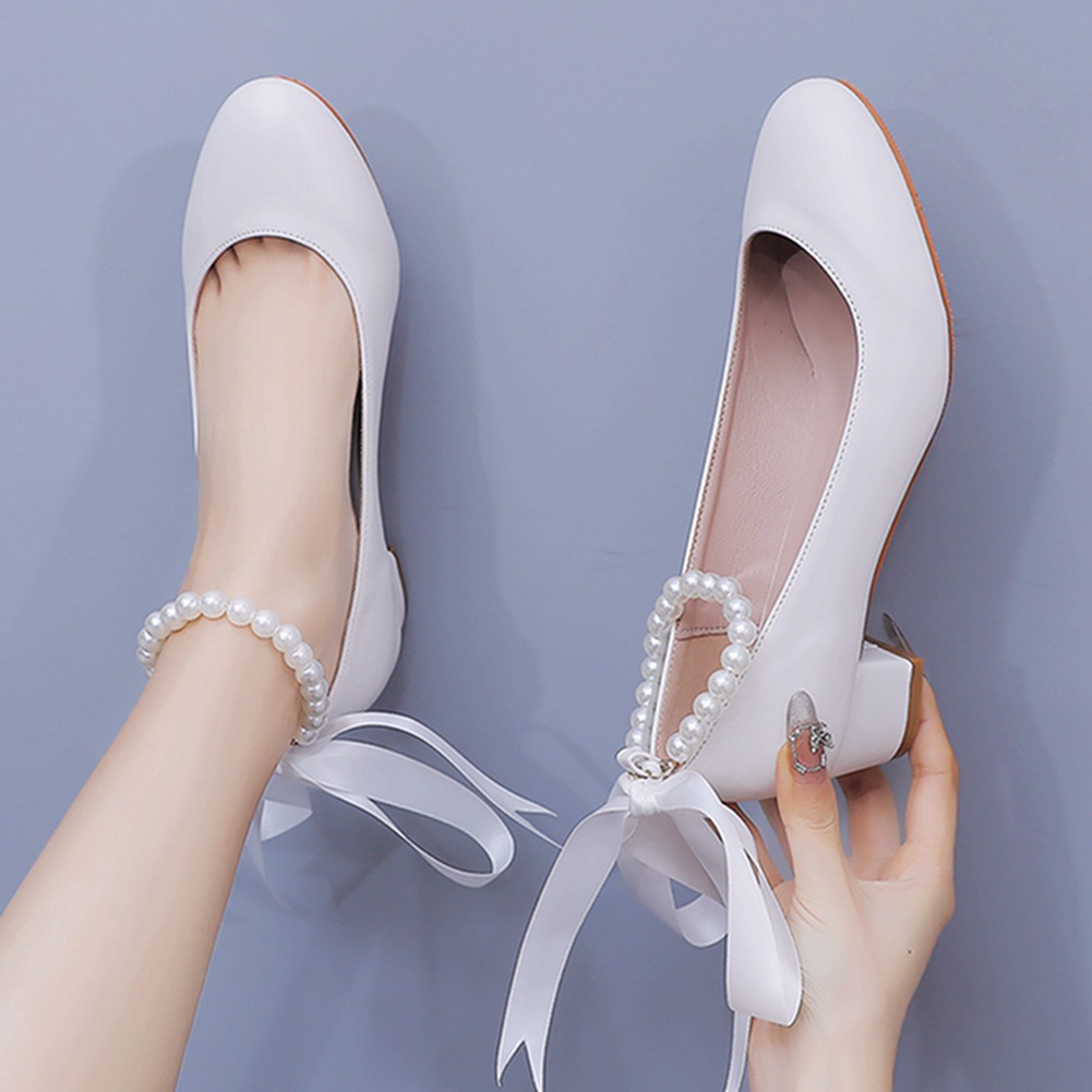 Breakj Breakj 3 Cm Square-Head Single Shoe With A Single Shoe Buckle Mary Jane White Shoes Beads Ribbon Wedding Shoes