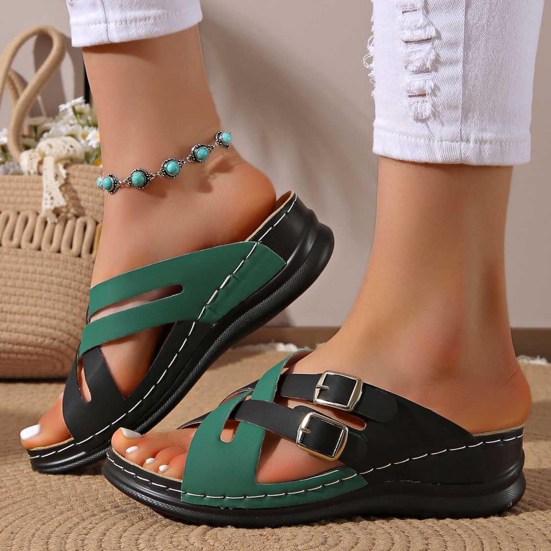 Breakj Breakj Flat-Bottom Slope And Leisure Slippers 2025 New Cross-S Thin Strip Solid-Colored Toe Fish Mouth Slippers