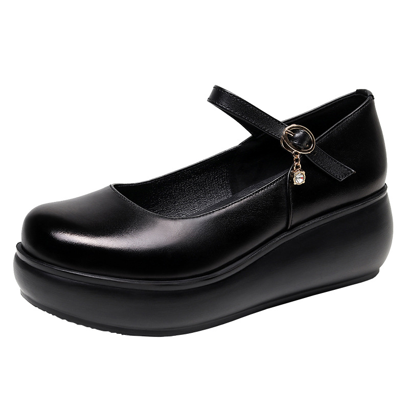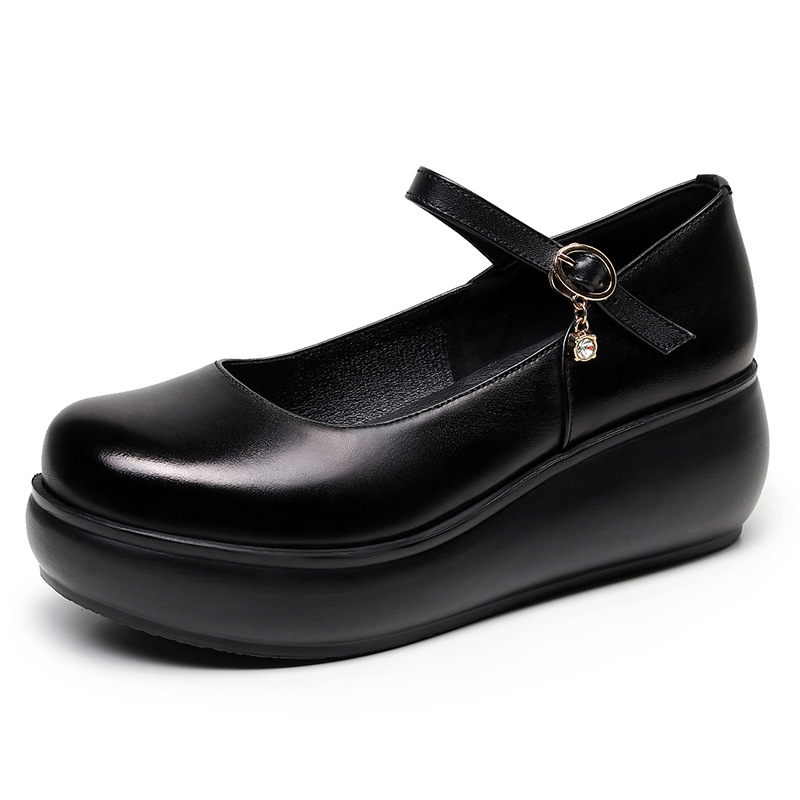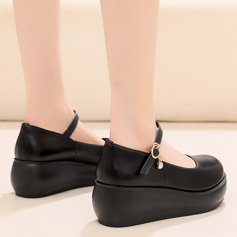 Breakj Breakj Skin Round Head Heel Slope And Shallow Mouth Single Shoes Waterproof Table Casual Leather Shoes Buckle With Loose Cake Thick-Soled Shoes Women Autumn