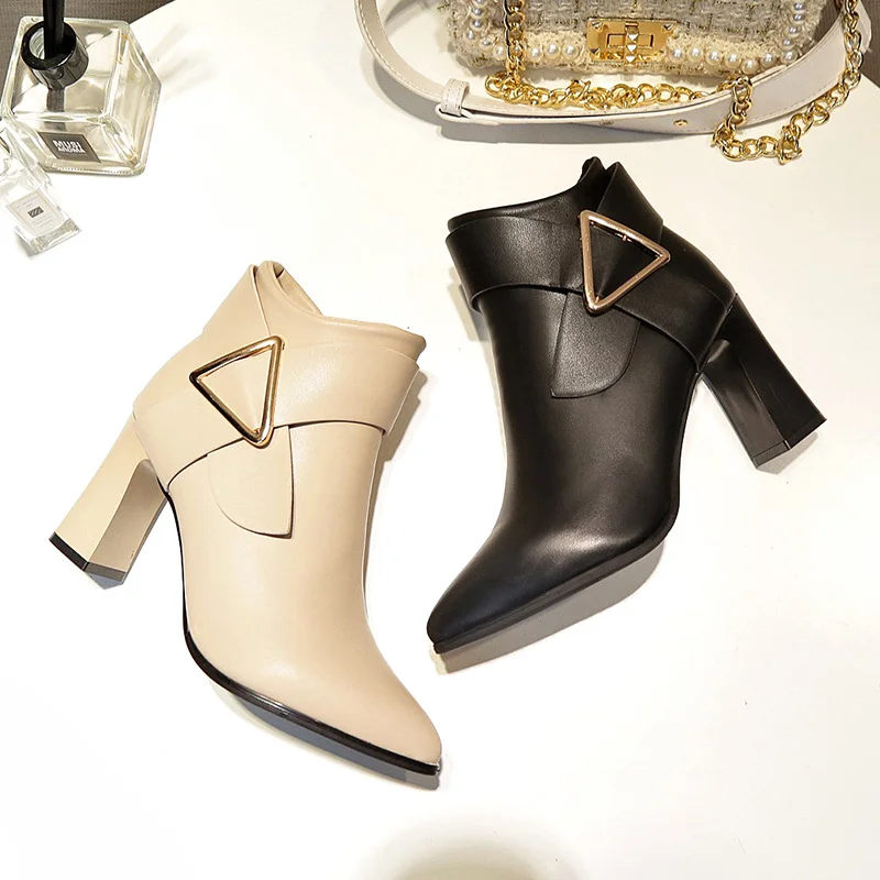 Breakj Breakj Women's Boots Korean Version Of Autumn And Winter New Pointed Short Barrel Metal Leather Buckle Decorative Side Zipper Coarse And Large Size Female Short Boots