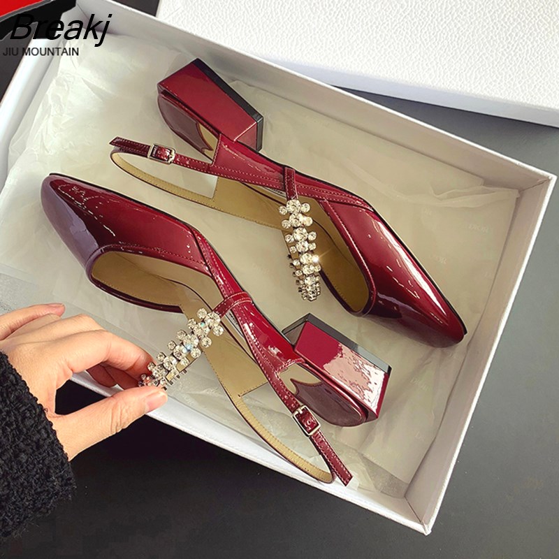 Breakj Flat Sandals Women Spring Summer Rhinestones Single Shoes Square Toe Simple Solid Color Buckle