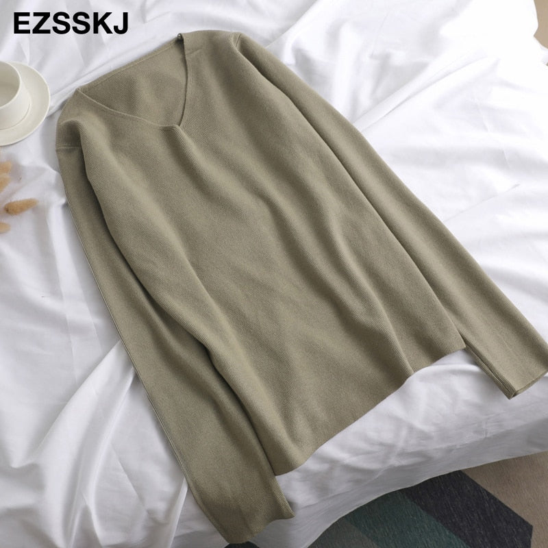chic casual Autumn Winter Basic v-neck Sweater pullovers Women 2021 loose Knit Pullover female Long Sleeve Khaki Sweater