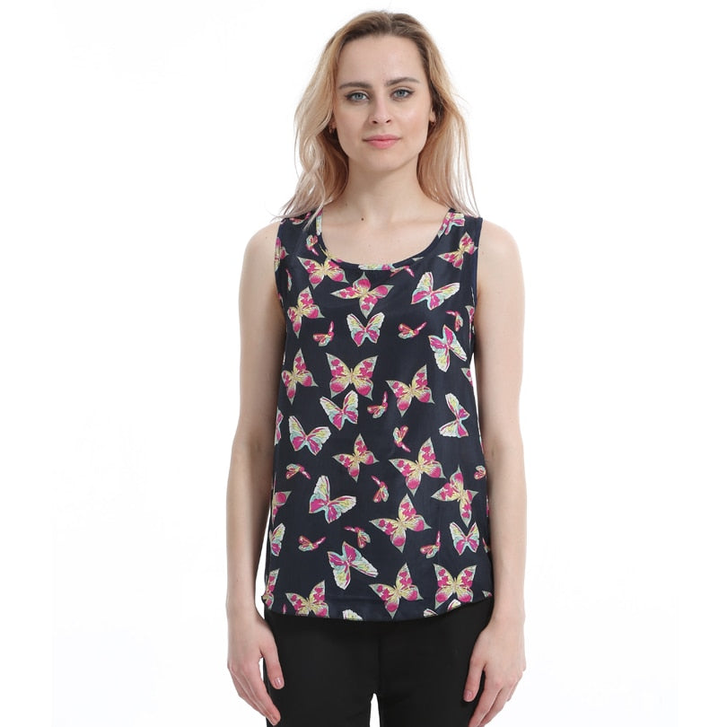CUHAKCI Butterfly Print Chiffon Tank Tops Sleeveless Tees O Neck Cropped Fashion Women Summer T Shirts