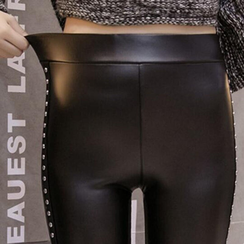 CUHAKCI PU Leather Fleece Women Fashion Rivets Velvet Winter Leggings Push Up Black Lady Trousers Pencil Pants