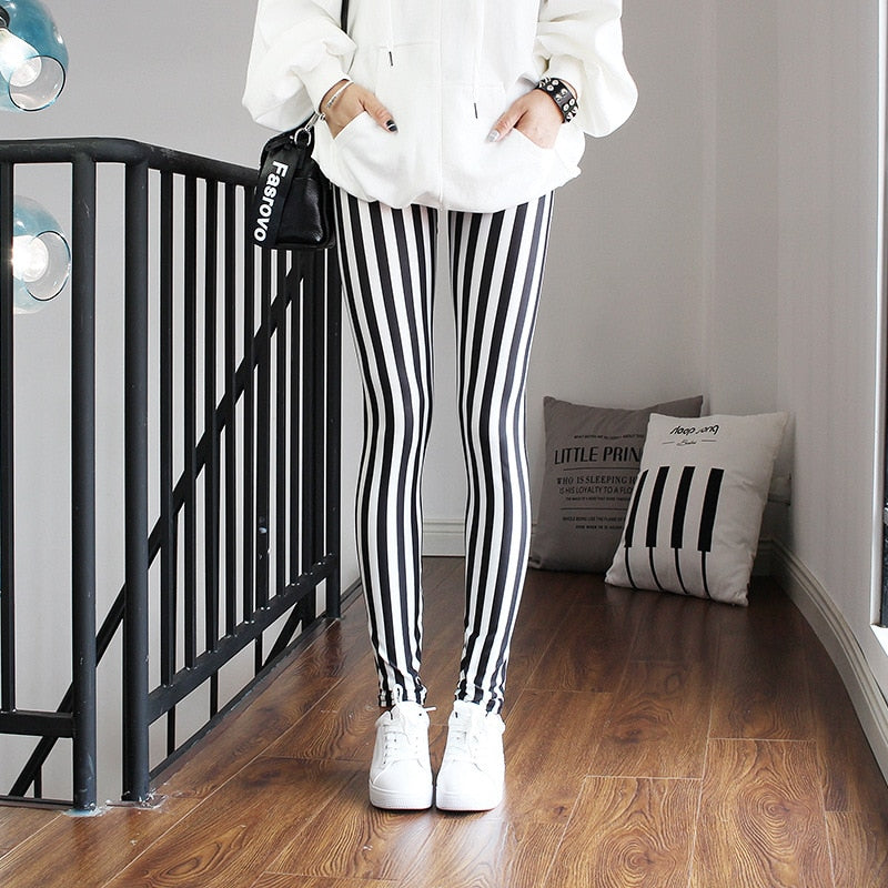CUHAKCI Push Up Leggins Mujer Stripe Printed Leggings Women Dot Mid Waist Polyester Fitness Pants
