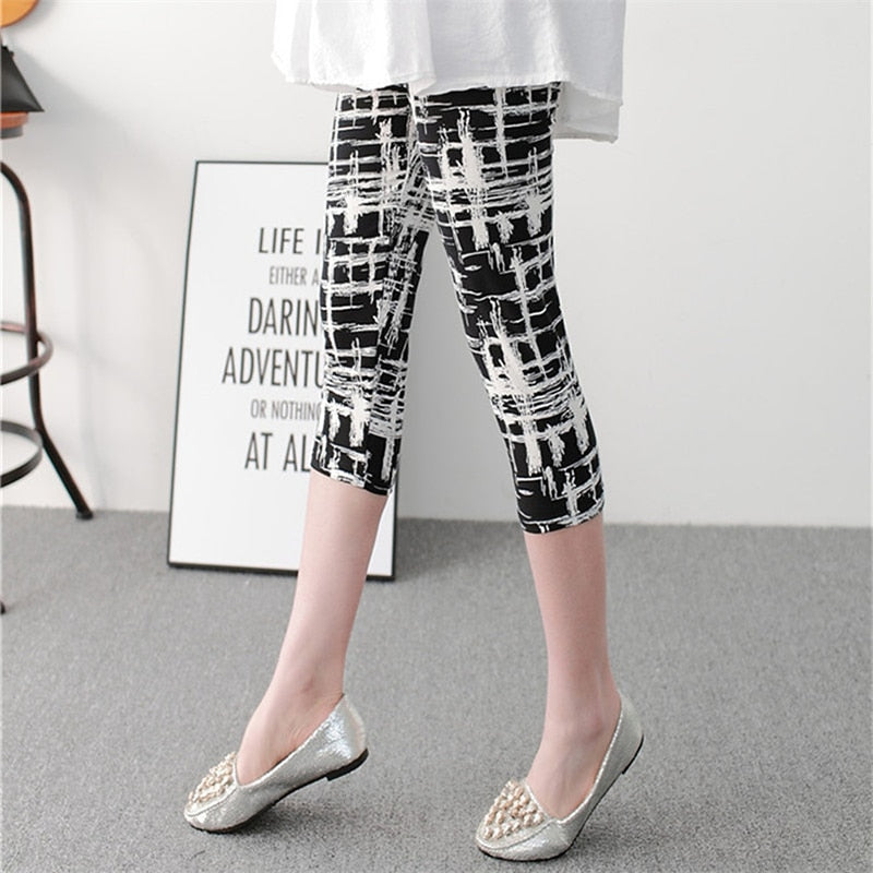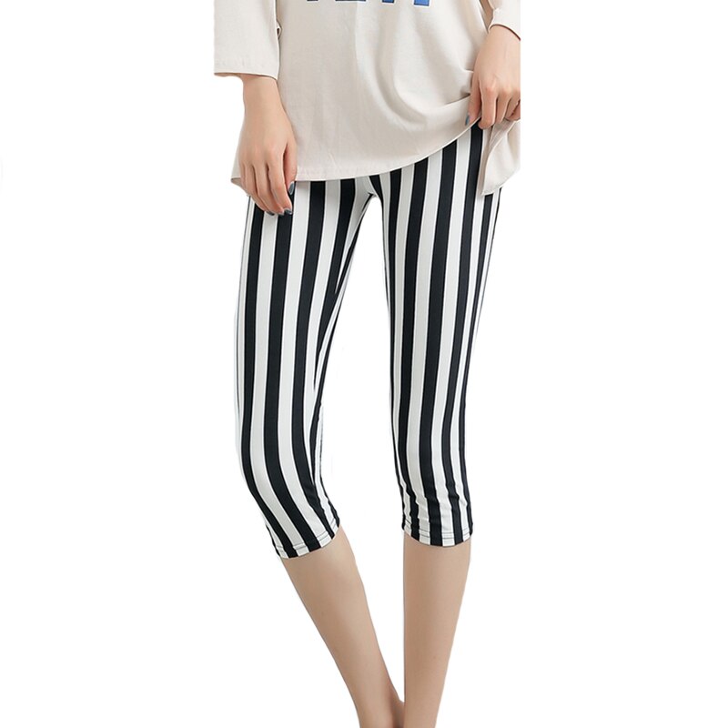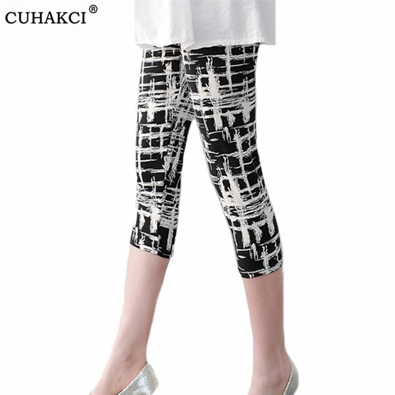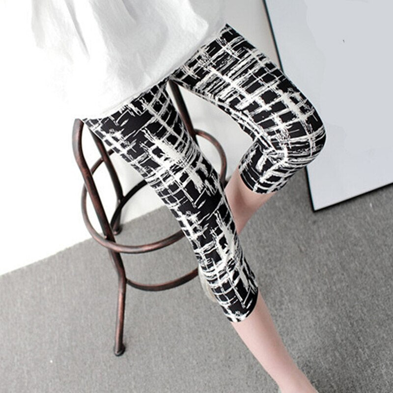 CUHAKCI Women's Calf-Length Leggings Print Grid Short Pant Mujer Casual Elasticity Stripe Fitness Leggins