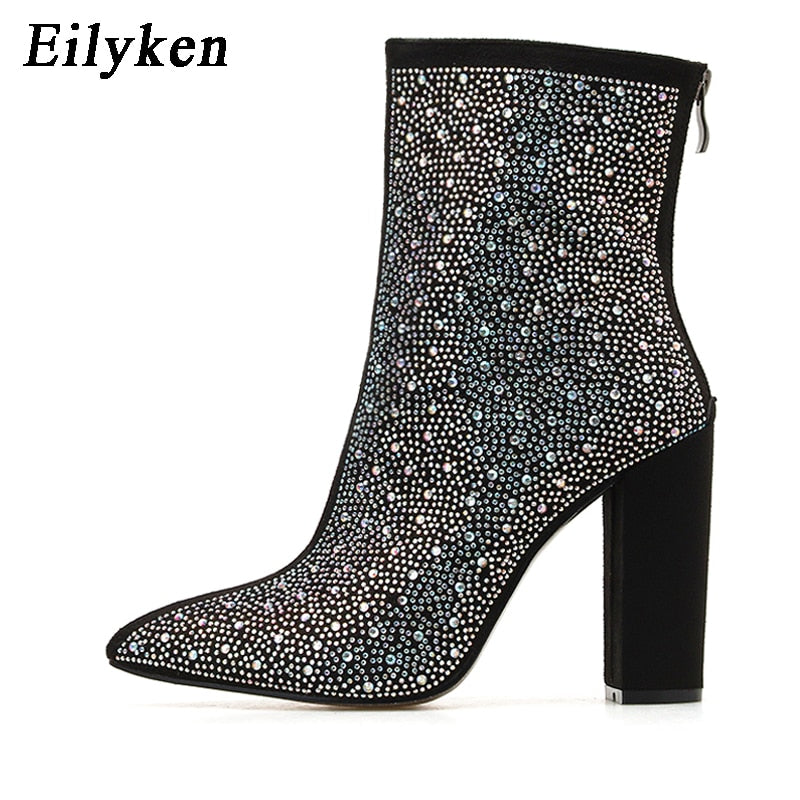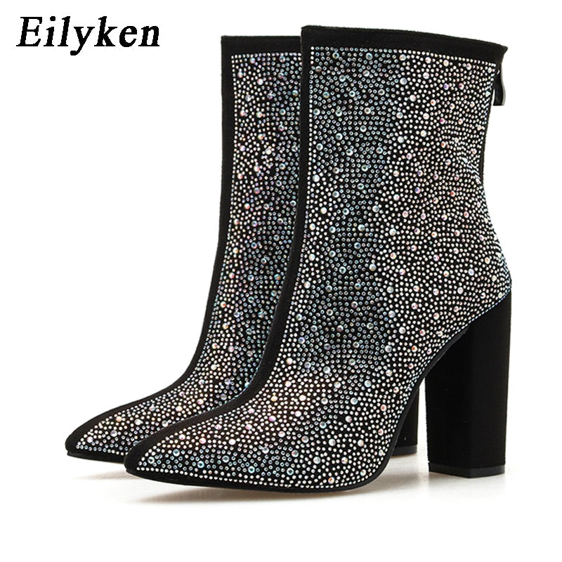 Eilyken 2022 Fashion Sexy Banquet Women's Boots Thick with Square Head Shiny Rhinestones Thin Nightclub High Heel Boots