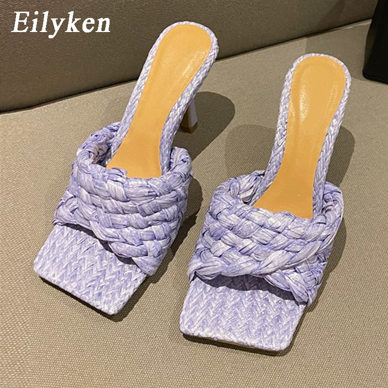 Eilyken 2022 New Summer Design Weave Square Toe Heels High Quality Slippers Gladiator Beach Womens Sandal Slides Shoes