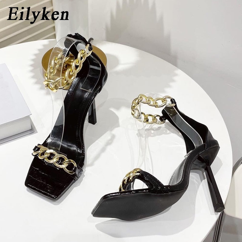 Eilyken New Women Sandals Summer Square Toe Thin High Heels Female Fashion Chain Designer Strap Party Dress Shoes Size 41 Green 530