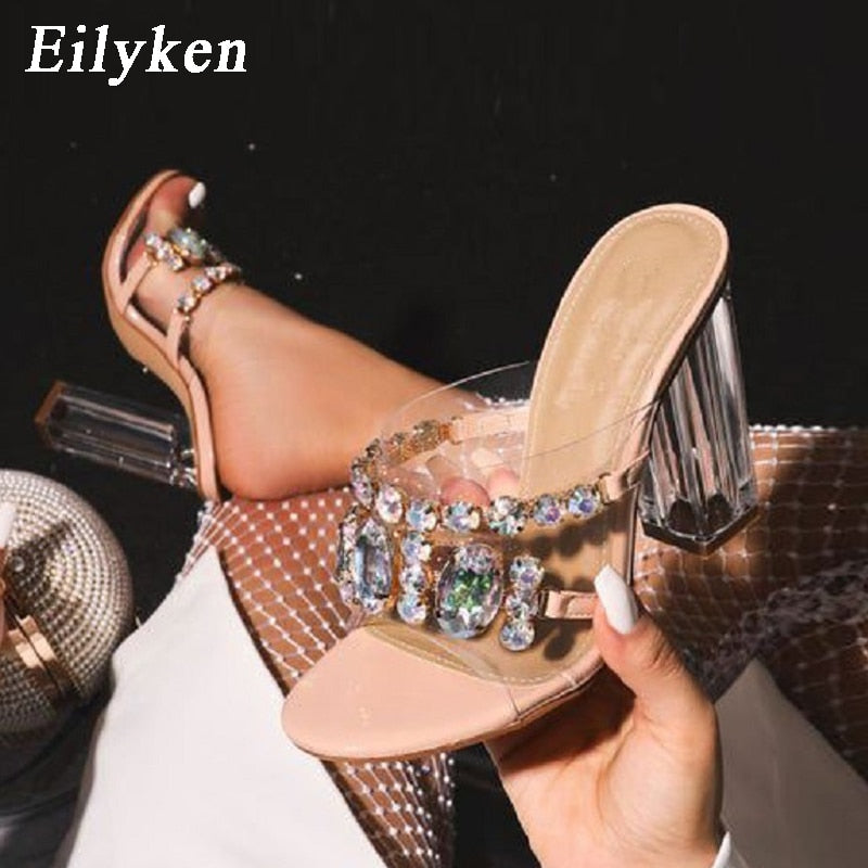 Eilyken Rhinestone Bright color Crystal Slippers Open Toe High Heels Shoes Woman Crystal Transparent Heeled  Slippers Sandals