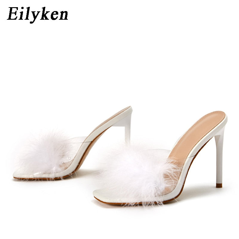 Eilyken Woman Feather High heels Fur PVC Slippers Sandals Women Peep toe Mules Lady Pumps Slides White Pink Black size 35-42