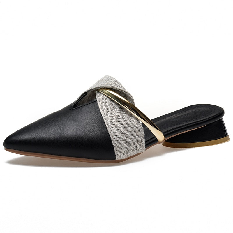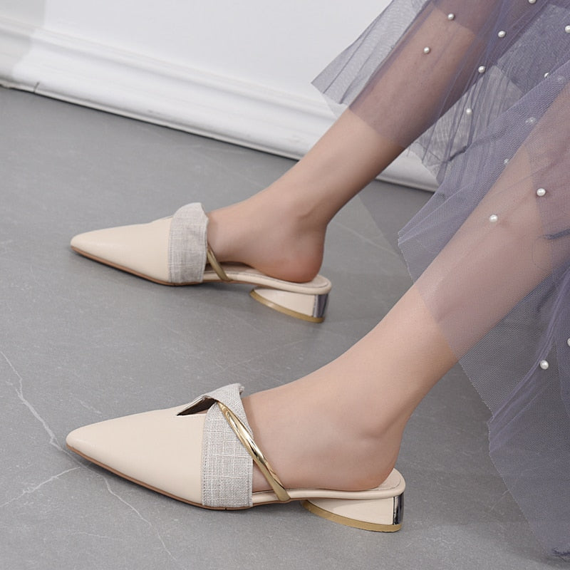 Elegant Low Heel Women Mules Summer Sexy Pointed-Toe Ladies Slippers Slip on Leisure Ladies Office Shoes Beige Pumps Female