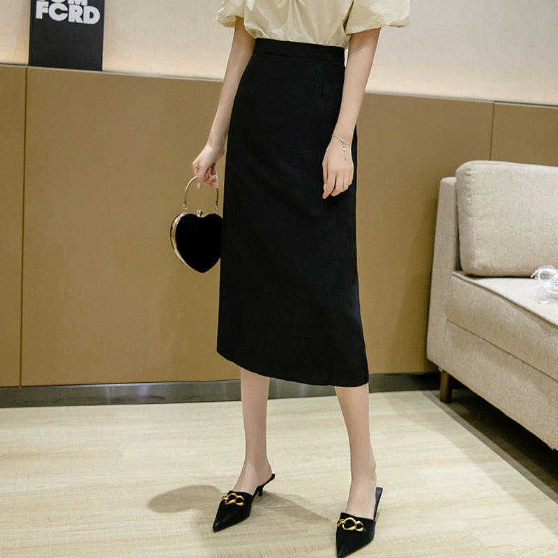 FTLZZ 2021 New Spring Summer Women High Waist Solid Color Medium Long Skirt Casual Female Slim Fit OL Style Split Black Skirts