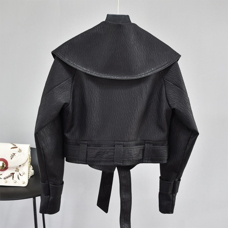 FTLZZ Autumn Women Pu Leather Jackets Short Coat Turndown Collar Belt Lace-up Motorcycle Black Punk Red Overcoat Female Outwear