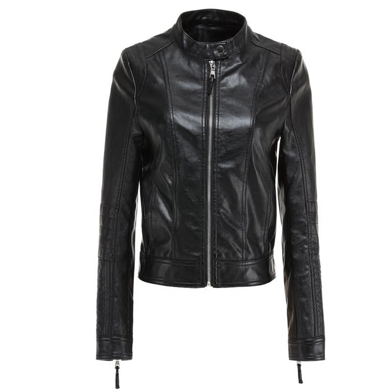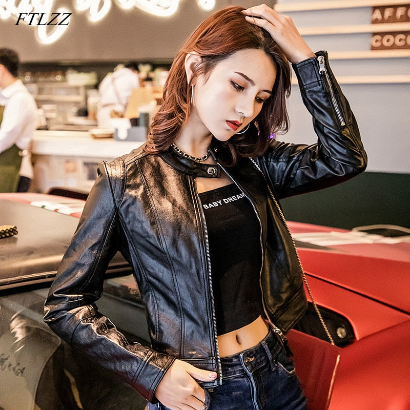 FTLZZ European Style O Neck PU Leather Jacket New Fashion Motorcycle Leather Outwear Women Slim Biker Coat Basic Streetwear