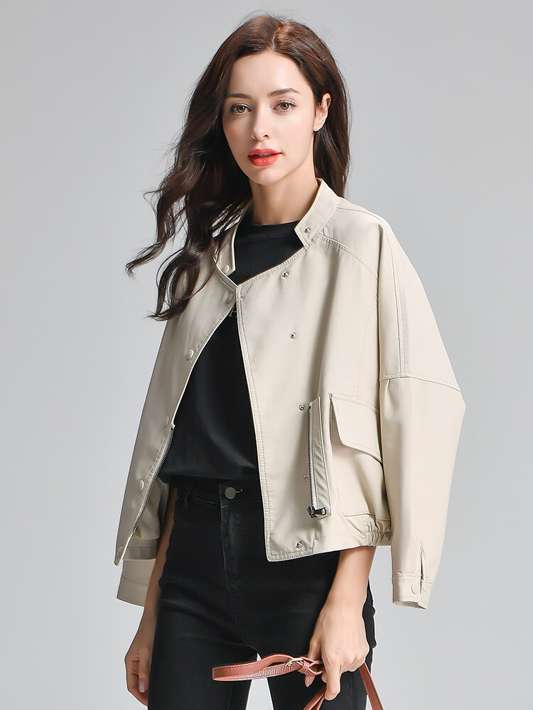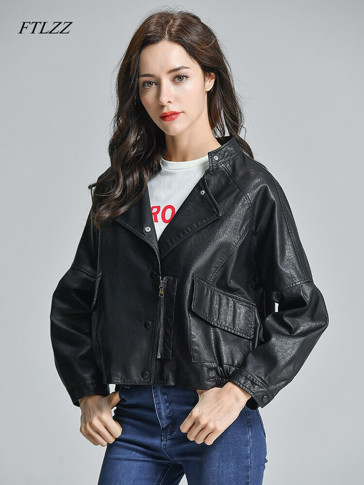 FTLZZ Harajuku Faux Leather Jacket Women Batwing Sleeve Pocket Black Biker Coat Female Spring Autumn Pink Basic Outwear