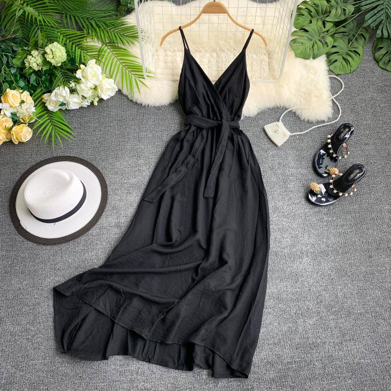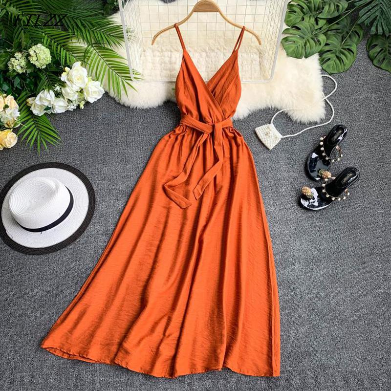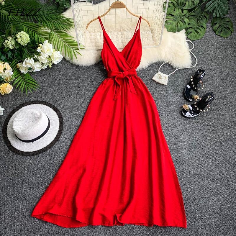 FTLZZ Maldives Holiday Dress Sexy Backless Straps V-neck Dress Women Solid Color Thai Seaside Maxi Long Big Swing Fairy Dress