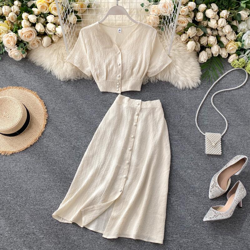 FTLZZ New Summer Women Casual V Neck Single Breasted Crop Tops High Waist A-line Solid Color Skirt Two Piece Set