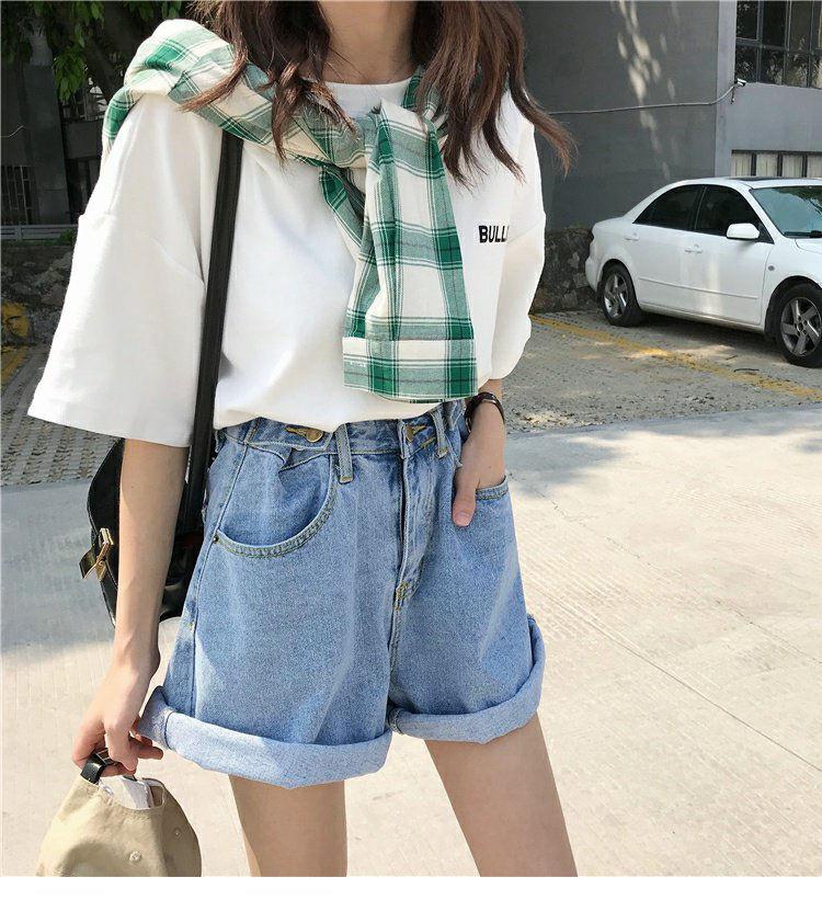 FTLZZ New Summer Women High Waist Blue Denim Shorts Vintage Female Wide Leg Solid Color Loose Jeans Shorts