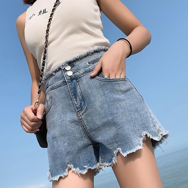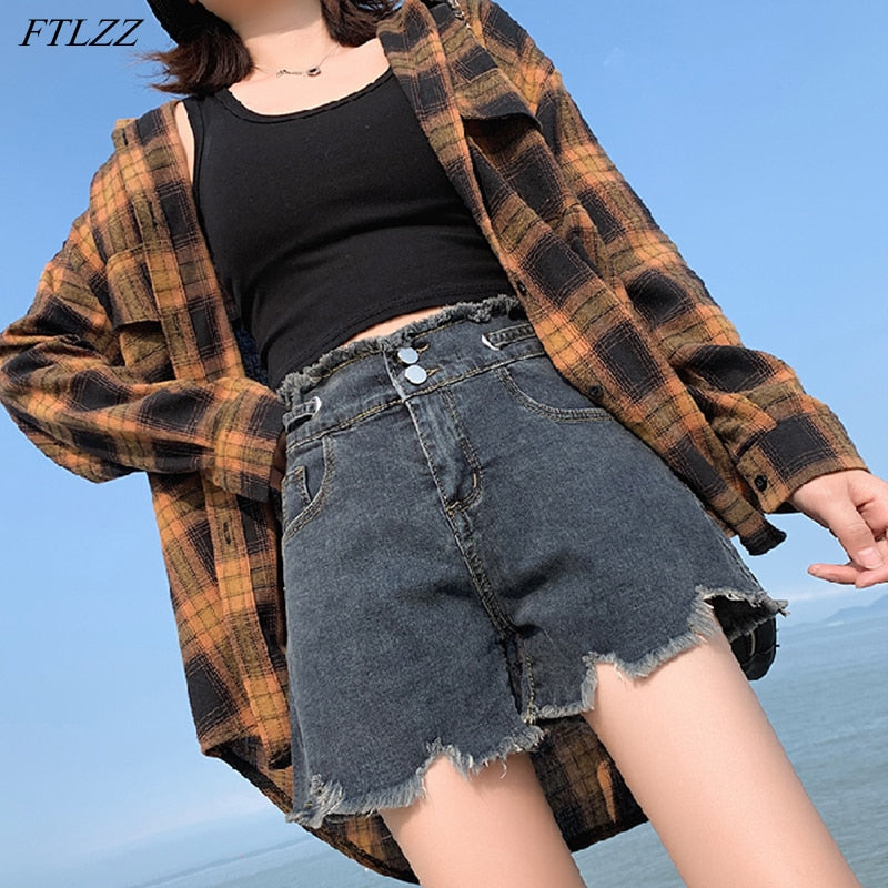 FTLZZ New Summer Women High Waist Hole Blue Denim Shorts Casual Female Single Breasted Jeans Vintage Ladies Shorts