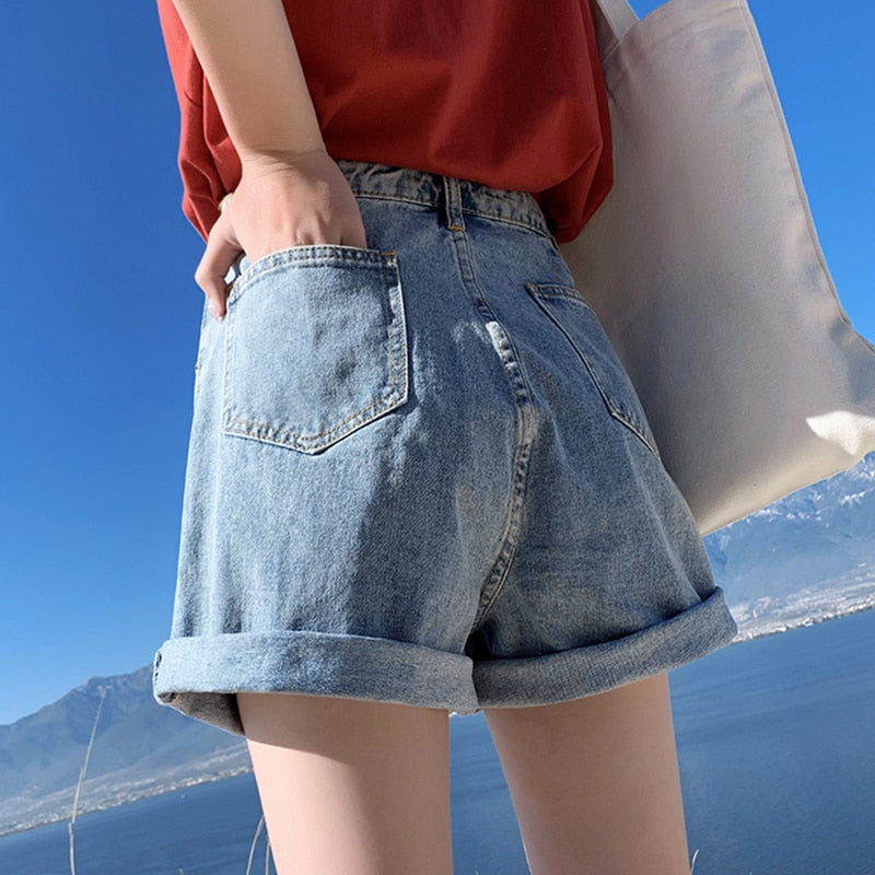 FTLZZ New Summer Women High Waist Wide Leg Denim Shorts Casual Female Loose Fit Streetwear Solid Color Straight  Jeans Shorts