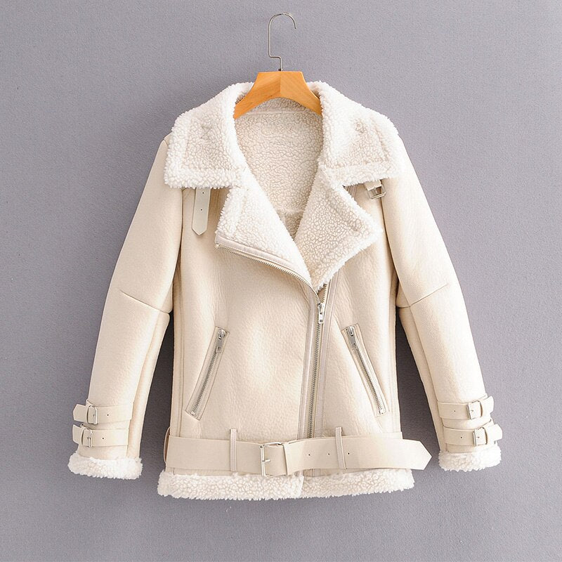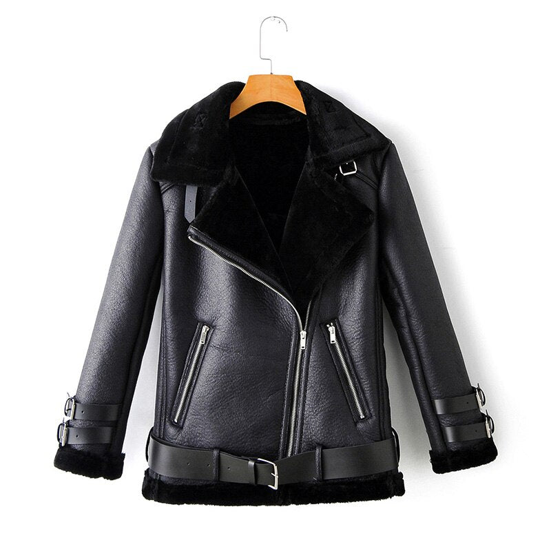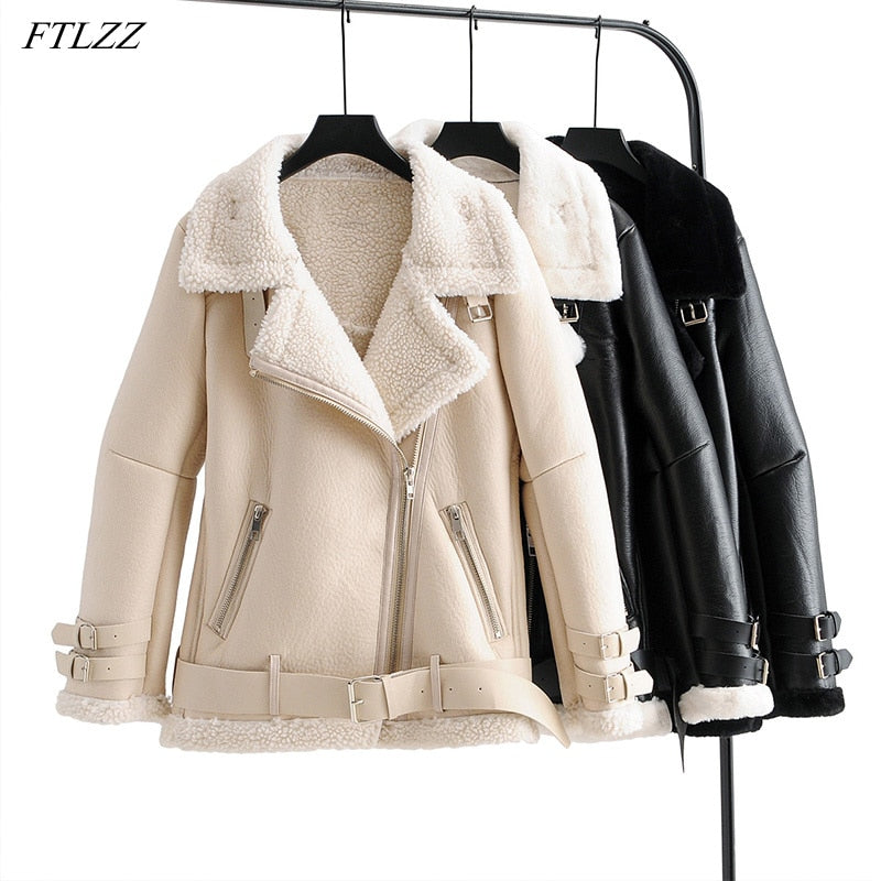 FTLZZ New Winter Women Faux Lamb Leather Jacket Turn Down Collar Wool Fur Collar Pu Moto Zipper Jacket Warm Thick Outerwear